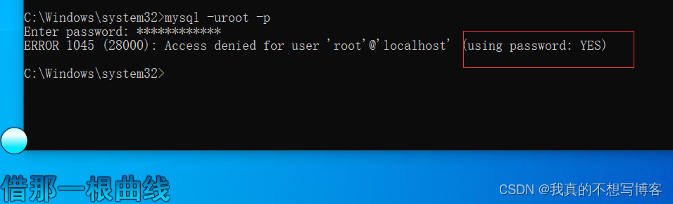 然后输入这个命令mysql -uroot -p,回车输入密码,登录你的MySQL数据库,红色框框里面password后面出现yes就说明你登录失败了