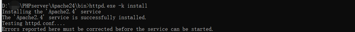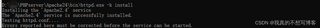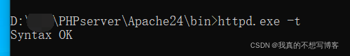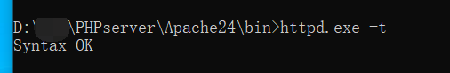 然后用httpd.exe -t命令查看apache路径是否正确,提示Syntax OK就是正确的