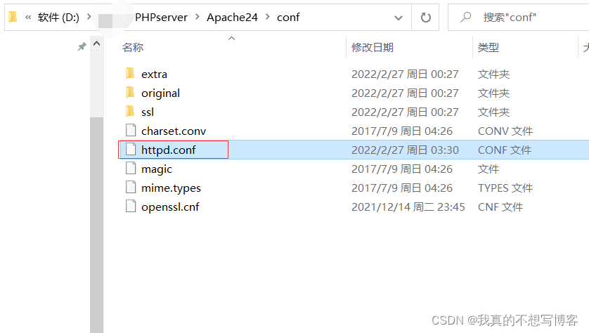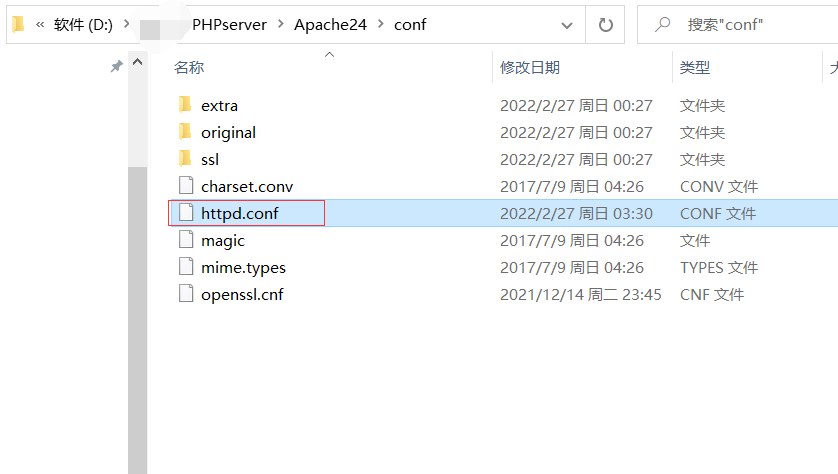 二、解压完后进入conf目录,找到httpd.conf文件,用记事本或者其他编辑器打开