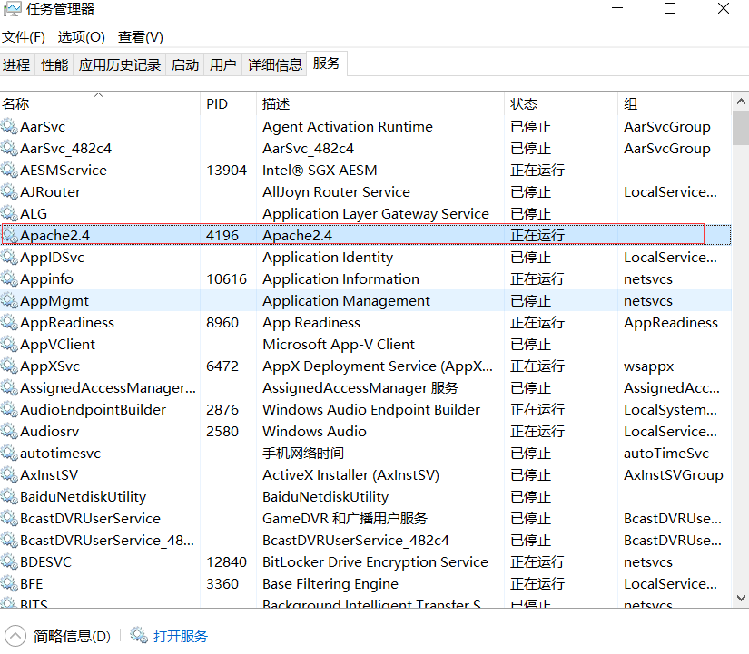 重新启动之后打开任务管理,点击服务就可以发现apache服务正在运行