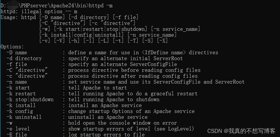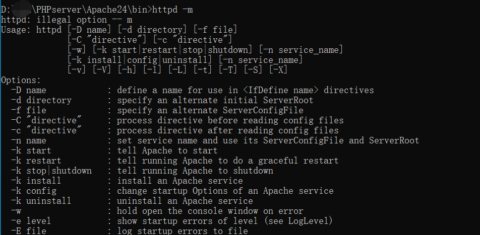 配置完后再用管理员方式打开cmd进入apache的bin目录然后输入httpd -m命令进行更新,然后进行下面的php测试,如果测试那个界面没出来就需要重新启动电脑,如果出现了测试页面就不需要重新启动电脑。