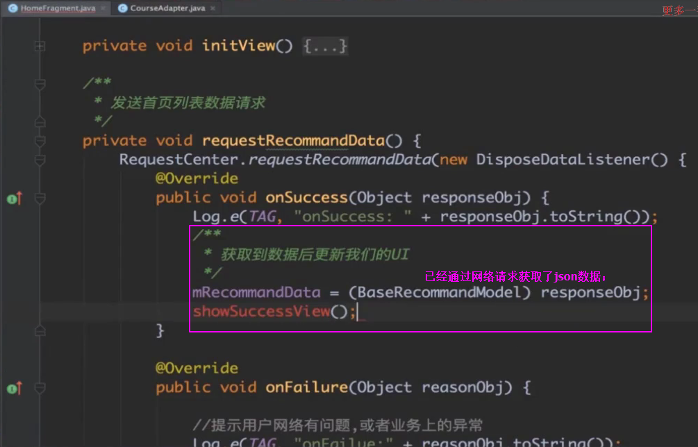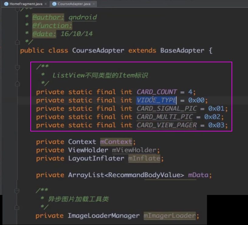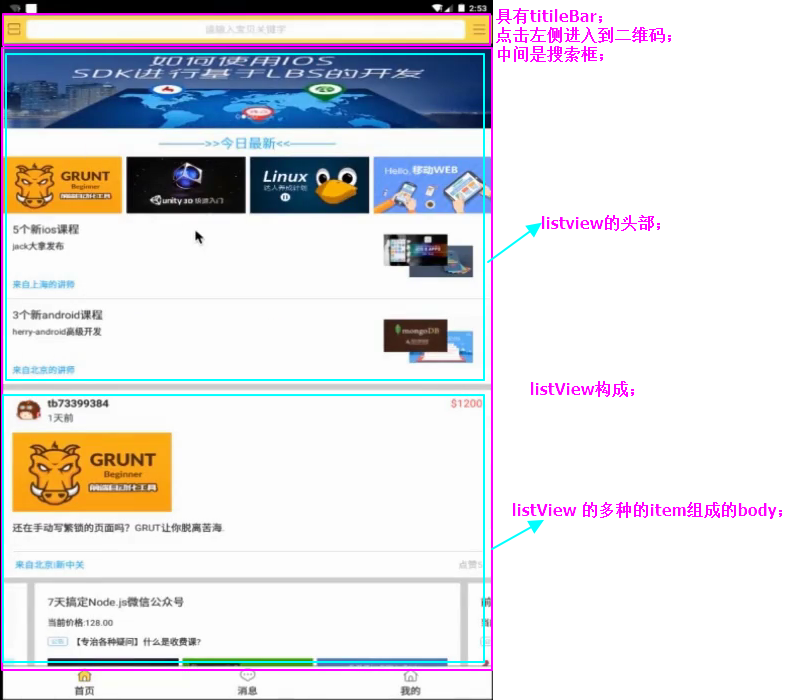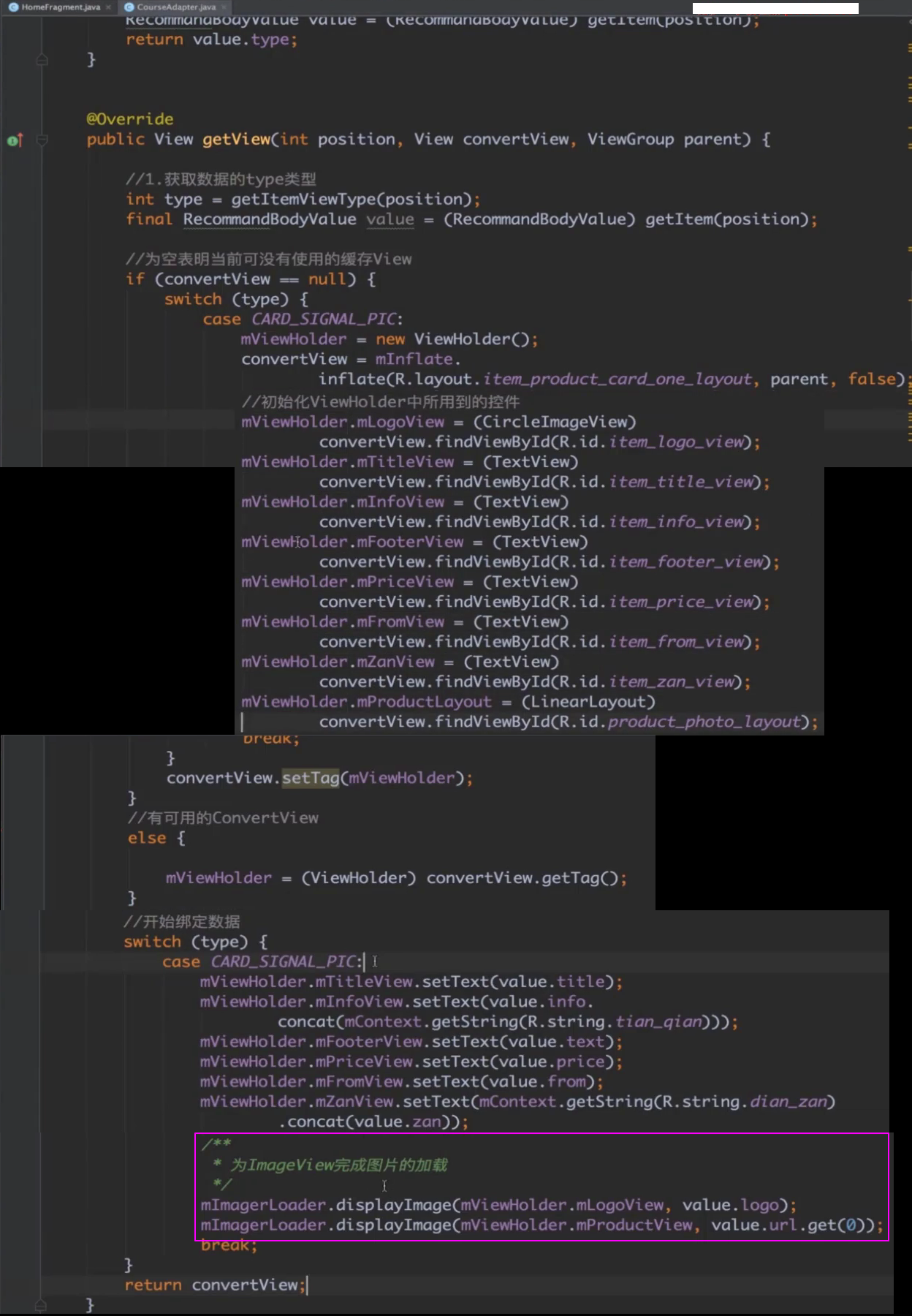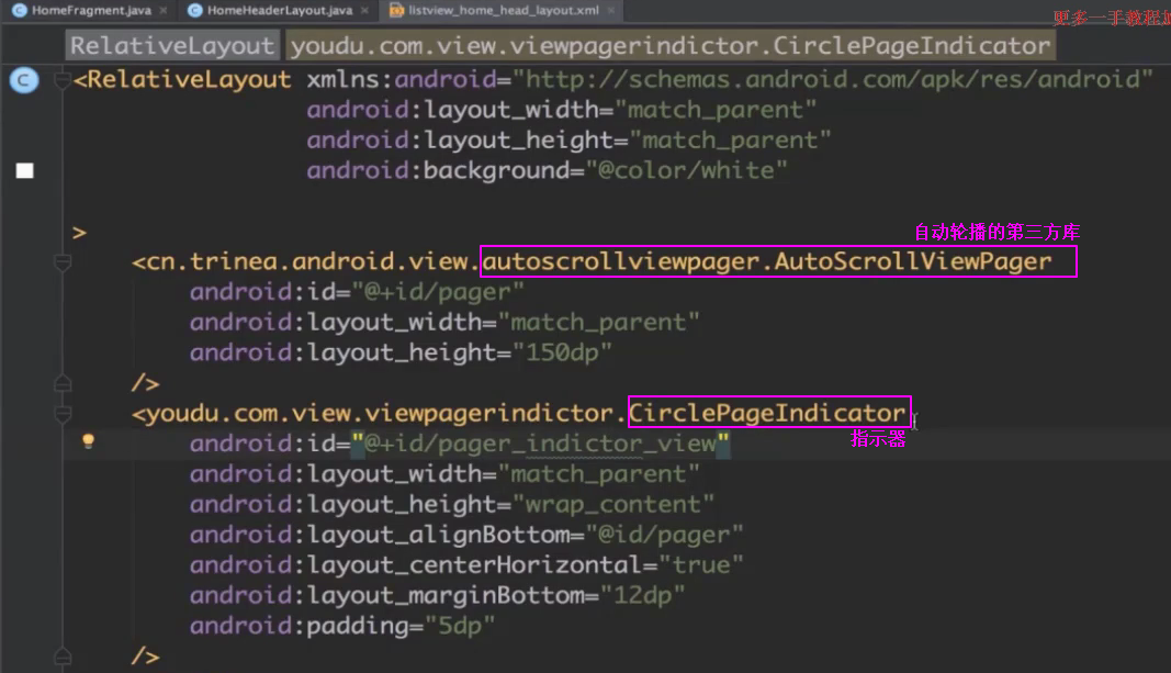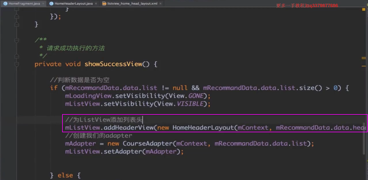 【在首页中添加头布局】此处使用的的add方法,而在设置适配器的时候使用的是setAdapter(会覆盖原始的数据);add可以可以添加多个布局的;因为可以设置多个头布局;尾部的布局也是可以多次添加的;