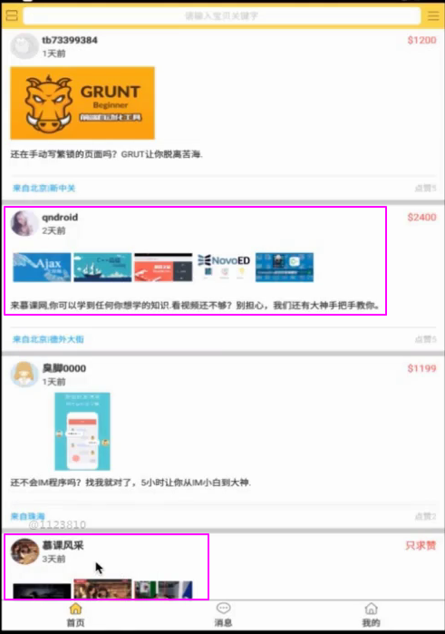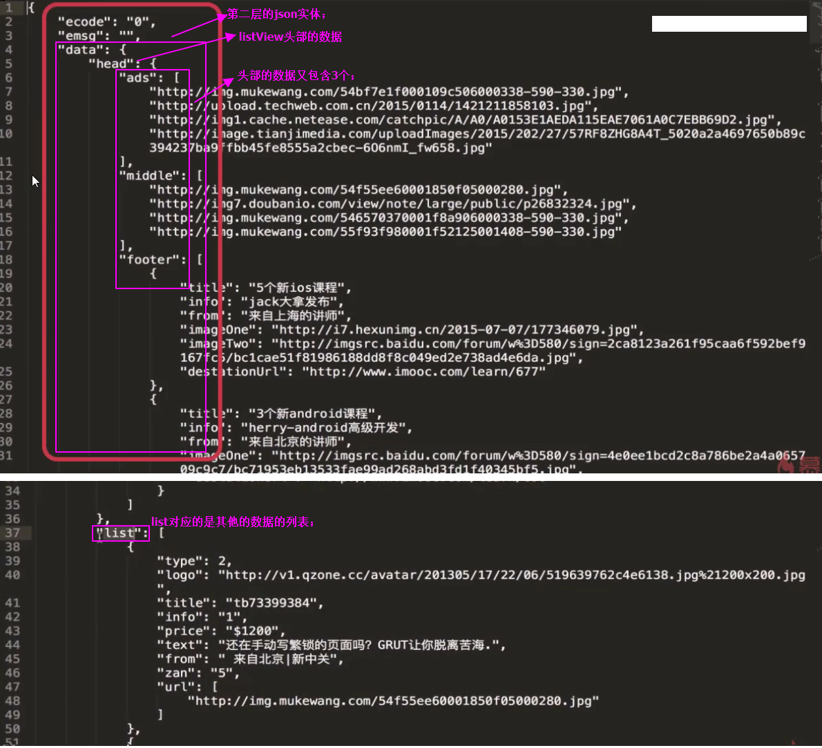 1 { 2 "ecode": "0", 3 "emsg": "", 4 "data": { 5 "head": { 6 "ads": [ 7 "http://img.mukewang.com/54bf7e1f000109c506000338-590-330.jpg", 8 "http://upload.techweb.com.cn/2015/0114/1421211858103.jpg", 9 "http://img1.cache.netease.com/catchpic/A/A0/A0153E1AEDA115EAE7061A0C7EBB69D2.jpg", 10 "http://image.tianjimedia.com/uploadImages/2015/202/27/57RF8ZHG8A4T_5020a2a4697650b89c394237ba9ffbb45fe8555a2cbec-6O6nmI_fw658.jpg" 11 ], 12 "middle": [ 13 "http://img.mukewang.com/54f55ee60001850f05000280.jpg", 14 "http://img7.doubanio.com/view/note/large/public/p26832324.jpg", 15 "http://img.mukewang.com/546570370001f8a906000338-590-330.jpg", 16 "http://img.mukewang.com/55f93f980001f52125001408-590-330.jpg" 17 ], 18 "footer": [ 19 { 20 "title": "5个新ios课程", 21 "info": "jack大拿发布", 22 "from": "来自上海的讲师", 23 "imageOne": "http://i7.hexunimg.cn/2015-07-07/177346079.jpg", 24 "imageTwo": "http://imgsrc.baidu.com/forum/w%3D580/sign=2ca8123a261f95caa6f592bef9167fc5/bc1cae51f81986188dd8f8c049ed2e738ad4e6da.jpg", 25 "destationUrl": "http://www.imooc.com/learn/677" 26 }, 27 { 28 "title": "3个新android课程", 29 "info": "herry-android高级开发", 30 "from": "来自北京的讲师", 31 "imageOne": "http://imgsrc.baidu.com/forum/w%3D580/sign=4e0ee1bcd2c8a786be2a4a065709c9c7/bc71953eb13533fae99ad268abd3fd1f40345bf5.jpg", 32 "imageTwo": "//images0.cnblogs.com/news/66372/201412/041520272014384.png", 33 "destationUrl": "http://www.imooc.com/learn/690" 34 } 35 ] 36 }, 37 "list": [ 38 { 39 "type": 2, 40 "logo": "http://v1.qzone.cc/avatar/201305/17/22/06/519639762c4e6138.jpg%21200x200.jpg", 41 "title": "tb73399384", 42 "info": "1", 43 "price": "$1200", 44 "text": "还在手动写繁锁的页面吗?GRUT让你脱离苦海.", 45 "from": " 来自北京|新中关", 46 "zan": "5", 47 "url": [ 48 "http://img.mukewang.com/54f55ee60001850f05000280.jpg" 49 ] 50 }, 51 { 52 "type": 3, 53 "title": "7天搞定Node.js微信公众号@前端到后台ThinkPHP开发整站@组件方式开发WebAPP全站@飞速上手的跨平台App开始@Yii2.0全力出击打造完整电商", 54 "price": "当前价格:128.00@当前价格:268.00@当前价格:78.00@当前价格:88.00@当前价格:168.00", 55 "info": "【专治各种疑问】什么是收费课?@【专治各种疑问】为什么要收费?@【专治各种疑问】收费课程的核心价值?@【专治各种疑问】收费课与免费课的区别?@【专治各种疑问】如何购买课程?", 56 "text": "842人在学@1353人在学@345人在学@1264人在学@737人在学", 57 "url": [ 58 "http://img.zcool.cn/community/01bba8564aefde32f87512f6a47ea3.jpg", 59 "http://i8.hexunimg.cn/2015-08-21/178515688.jpg", 60 "http://img.mukewang.com/54b619d70001294906000338-590-330.jpg", 61 "http://img.mukewang.com/539a5dac0001199007200404-500-284.jpg", 62 "http://img.mukewang.com/55657fa600015fe206000338-590-330.jpg", 63 "http://img.mukewang.com/5668dc790001aa2b06000338-590-330.jpg", 64 "http://img.mukewang.com/55f93f980001f52125001408-590-330.jpg", 65 "http://img0.imgtn.bdimg.com/it/u=2174499043,1857890027&fm=21&gp=0.jpg", 66 "http://img.mukewang.com/56556ecb00010b7806000338-590-330.jpg", 67 "http://img4.imgtn.bdimg.com/it/u=3072502270,3193310350&fm=21&gp=0.jpg", 68 "http://img.mukewang.com/56e617dd0001583d06000338-590-330.jpg", 69 "http://img.mukewang.com/5487a78e000105b606000338-590-330.jpg", 70 "http://img3.imgtn.bdimg.com/it/u=1105015795,3331123080&fm=21&gp=0.jpg", 71 "http://i0.hdslb.com/bfs/archive/cd265f24dae73ad0afaae638735b67749a8acfb5.jpg", 72 "http://i0.hdslb.com/bfs/archive/db522f316a9f555d8fa9bfe856c5a606612747d6.jpg" 73 ] 74 }, 75 { 76 "type": 0, 77 "logo": "http://b.hiphotos.baidu.com/zhidao/pic/item/d1a20cf431adcbefef0f982fabaf2edda3cc9fe4.jpg", 78 "title": "今日必学", 79 "info": "1", 80 "text": "想成为全栈工程师吗,MogoDB你的不二法宝.", 81 "site": "http://www.imooc.com/learn/595", 82 "from": "来自南京", 83 "zan": "10", 84 "resource": "http://fairee.vicp.net:83/2016rm/0116/baishi160116.mp4", 85 "adid": "00000001112", 86 "clickUrl": "http://www.imooc.com/", 87 "clickMonitor": [ 88 { 89 "ver": "0", 90 "url": "http://imooc.com/click??click=1" 91 }, 92 { 93 "ver": "0", 94 "url": "http://imooc.com/click?click=2" 95 } 96 ], 97 "startMonitor": [ 98 { 99 "ver": "0", 100 "url": "http://imooc.com/show?impression=1" 101 }, 102 { 103 "ver": "0", 104 "url": "http: //imooc.com/show?impression=2" 105 } 106 ], 107 "middleMonitor": [ 108 { 109 "ver": "0", 110 "url": "http://imooc.com/show?SU=1", 111 "time": 5 112 }, 113 { 114 "ver": "0", 115 "url": "http: //imooc.com/show?impression=2", 116 "time": 5 117 } 118 ], 119 "endMonitor": [ 120 { 121 "ver": "0", 122 "url": "http://imooc.com/show?end=1", 123 "time": 5 124 }, 125 { 126 "ver": "0", 127 "url": "http: //imooc.com/show?end=2", 128 "time": 5 129 } 130 ] 131 }, 132 { 133 "type": 1, 134 "logo": "http://img3.duitang.com/uploads/item/201407/01/20140701222607_AnKfj.thumb.224_0.jpeg", 135 "title": "qndroid", 136 "info": "2", 137 "price": "$2400", 138 "text": "来慕课网,你可以学到任何你想学的知识.看视频还不够?别担心,我们还有大神手把手教你。", 139 "from": " 来自北京|德外大街", 140 "zan": "5", 141 "url": [ 142 "http://img.mukewang.com/549bda090001c53e06000338-590-330.jpg", 143 "http://img.mukewang.com/5707604300018d0406000338-590-330.jpg", 144 "http://articles.csdn.net/uploads/allimg/150617/6_150617172820_1.png", 145 "http://f1.diyitui.com/b3/e1/db/5f/24/ea/d8/59/1e/ea/28/04/b3/57/d6/6f.jpg", 146 "http://upload1.techweb.com.cn/s/320/2015/0527/1432714922459.jpg" 147 ] 148 }, 149 { 150 "type": 2, 151 "logo": "http://img0.imgtn.bdimg.com/it/u=3266845821,3017593921&fm=21&gp=0.jpg", 152 "title": "臭脚0000", 153 "info": "1", 154 "price": "$1199", 155 "text": "还不会IM程序吗?找我就对了,5小时让你从IM小白到大神.", 156 "from": "来自珠海", 157 "zan": "2", 158 "url": [ 159 "http://it.enorth.com.cn/pic2014/002/000/092/00200009288_502cc21c.png" 160 ] 161 }, 162 { 1