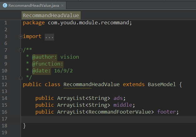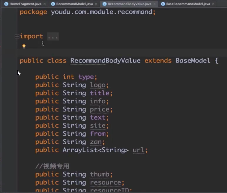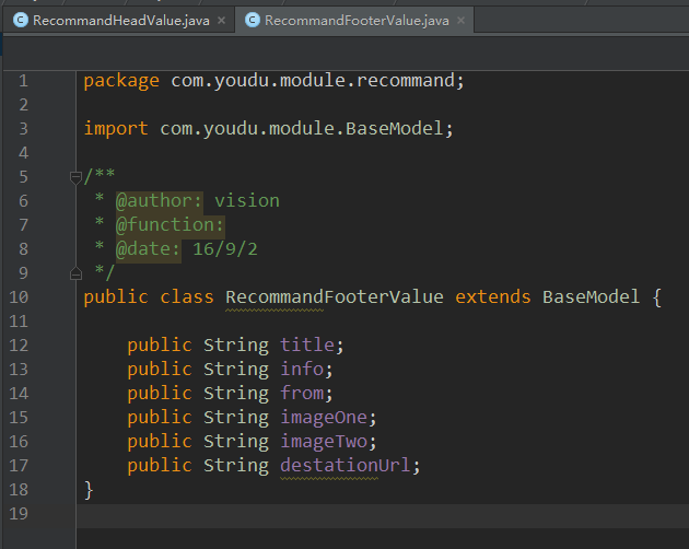 1 package com.youdu.module.recommand; 2 3 import com.youdu.module.BaseModel; 4 import com.youdu.module.monitor.Monitor; 5 import com.youdu.module.monitor.emevent.EMEvent; 6 7 import java.util.ArrayList; 8 9 /** 10 * ******************************************************* 11 * 12 * @文件名称:RecommandValue.java 13 * @文件描述:搜索实体 14 ******************************************************** 15 */ 16 public class RecommandBodyValue extends BaseModel { 17 18 public int type; 19 public String logo; 20 public String title; 21 public String info; 22 public String price; 23 public String text; 24 public String site; 25 public String from; 26 public String zan; 27 public ArrayList<String> url; 28 29 //视频专用 30 public String thumb; 31 public String resource; 32 public String resourceID; 33 public String adid; 34 public ArrayList<Monitor> startMonitor; 35 public ArrayList<Monitor> middleMonitor; 36 public ArrayList<Monitor> endMonitor; 37 public String clickUrl; 38 public ArrayList<Monitor> clickMonitor; 39 public EMEvent event; 40 41 }