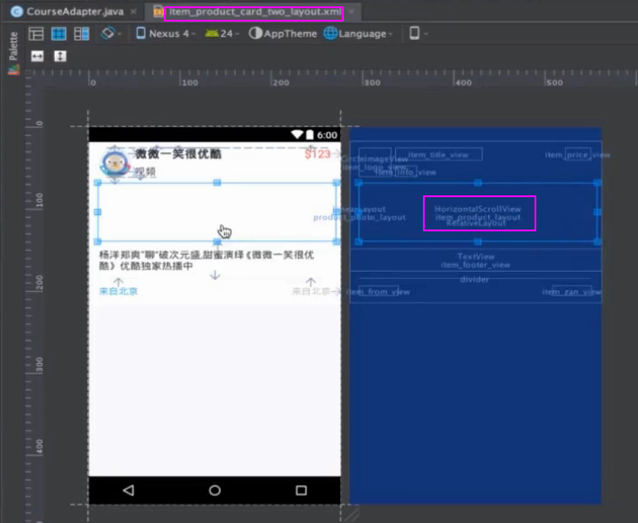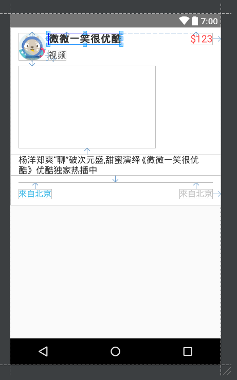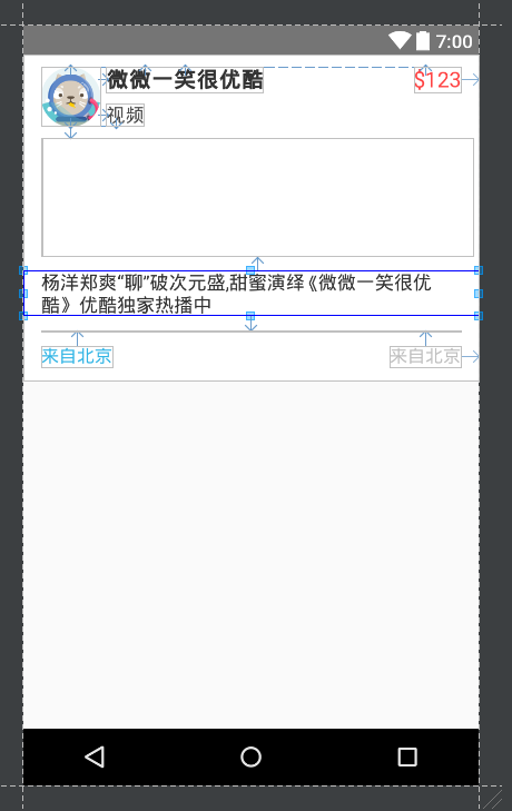 1 <RelativeLayout 2 xmlns:android="http://schemas.android.com/apk/res/android" 3 android:layout_width="match_parent" 4 android:layout_height="wrap_content" 5 android:background="@color/white" 6 > 7 8 <de.hdodenhof.circleimageview.CircleImageView 9 android:id="@+id/item_logo_view" 10 android:layout_width="50dp" 11 android:layout_height="50dp" 12 android:layout_marginBottom="10dp" 13 android:layout_marginLeft="15dp" 14 android:layout_marginRight="5dp" 15 android:layout_marginTop="10dp" 16 android:background="@drawable/default_user_avatar" 17 /> 18 19 <TextView 20 android:id="@+id/item_title_view" 21 android:layout_width="wrap_content" 22 android:layout_height="wrap_content" 23 android:layout_alignTop="@id/item_logo_view" 24 android:layout_toRightOf="@id/item_logo_view" 25 android:text="微微一笑很优酷" 26 android:textColor="@color/color_333333" 27 android:textSize="18sp" 28 android:textStyle="bold"/> 29 30 <TextView 31 android:id="@+id/item_price_view" 32 android:layout_width="wrap_content" 33 android:layout_height="wrap_content" 34 android:layout_alignParentRight="true" 35 android:layout_alignTop="@id/item_title_view" 36 android:layout_marginRight="15dp" 37 android:text="$123" 38 android:textColor="@color/color_ffff4444" 39 android:textSize="18sp" 40 /> 41 42 <TextView 43 android:id="@+id/item_info_view" 44 android:layout_width="wrap_content" 45 android:layout_height="wrap_content" 46 android:layout_alignBottom="@id/item_logo_view" 47 android:layout_toRightOf="@id/item_logo_view" 48 android:text="@string/video" 49 android:textColor="@color/result_view" 50 android:textSize="16sp" 51 /> 52 53 54 <ImageView 55 android:id="@+id/product_photo_view" 56 android:layout_width="250dp" 57 android:layout_height="150dp" 58 android:layout_below="@id/item_logo_view" 59 android:layout_marginLeft="15dp" 60 android:layout_marginRight="5dp" 61 /> 62 63 <TextView 64 android:id="@+id/item_footer_view" 65 android:layout_width="match_parent" 66 android:layout_height="wrap_content" 67 android:layout_below="@id/product_photo_view" 68 android:layout_marginBottom="12dp" 69 android:layout_marginTop="12dp" 70 android:ellipsize="end" 71 android:lines="2" 72 android:paddingLeft="15dp" 73 android:paddingRight="15dp" 74 android:text="杨洋郑爽“聊”破次元盛,甜蜜演绎《微微一笑很优酷》优酷独家热播中" 75 android:textColor="@color/color_333333" 76 android:textSize="16sp"/> 77 78 <View 79 android:id="@+id/divider" 80 android:layout_width="match_parent" 81 android:layout_height="0.5dp" 82 android:layout_below="@id/item_footer_view" 83 android:layout_marginLeft="15dp" 84 android:layout_marginRight="15dp" 85 android:background="@color/color_d0d0d0" 86 /> 87 88 <TextView 89 android:id="@+id/item_from_view" 90 android:layout_width="wrap_content" 91 android:layout_height="wrap_content" 92 android:layout_below="@id/divider" 93 android:layout_marginBottom="12dp" 94 android:layout_marginLeft="15dp" 95 android:layout_marginTop="12dp" 96 android:text="来自北京" 97 android:textColor="@android:color/holo_blue_light" 98 android:textSize="15sp" 99 /> 100 101 <TextView 102 android:id="@+id/item_zan_view" 103 android:layout_width="wrap_content" 104 android:layout_height="wrap_content" 105 android:layout_alignParentRight="true" 106 android:layout_below="@id/divider" 107 android:layout_marginBottom="12dp" 108 android:layout_marginRight="15dp" 109 android:layout_marginTop="12dp" 110 android:text="来自北京" 111 android:textColor="@color/color_bfbfbf" 112 android:textSize="15sp" 113 /> 114 </RelativeLayout>
