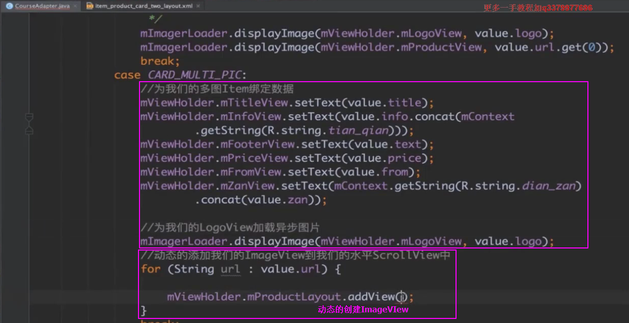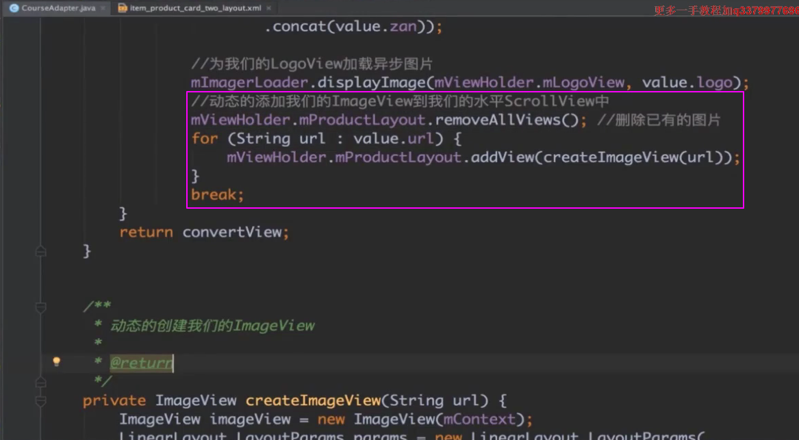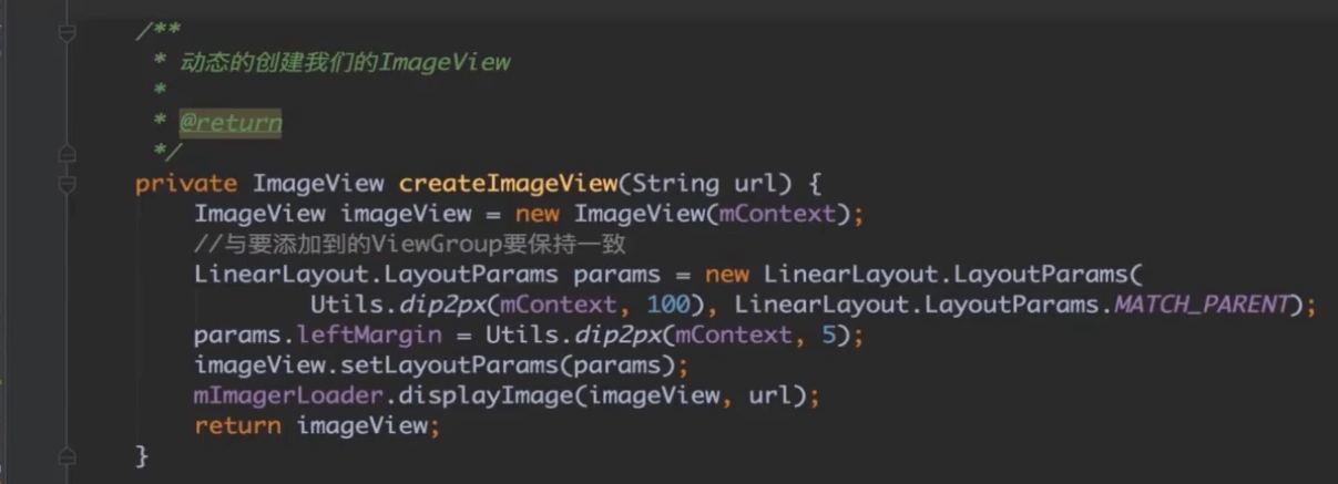 【动态创建ImageView】与静态xml中创建iamgeView控件的步骤是一致的,先创建对象,然后设置一系列的属性;【注意】设置设置属性的布局要与父控件保持一致;