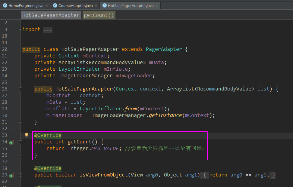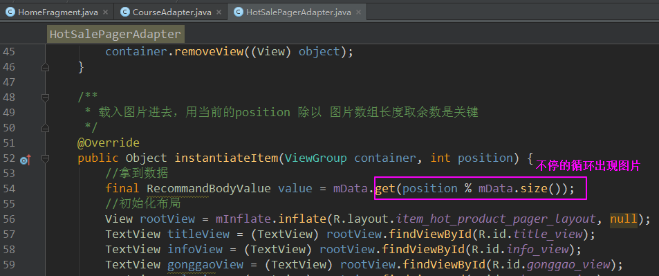 1 package com.youdu.adapter; 2 3 import android.content.Context; 4 import android.content.Intent; 5 import android.support.v4.view.PagerAdapter; 6 import android.view.LayoutInflater; 7 import android.view.View; 8 import android.view.ViewGroup; 9 import android.widget.ImageView; 10 import android.widget.TextView; 11 12 import com.youdu.R; 13 import com.youdu.activity.CourseDetailActivity; 14 import com.youdu.module.recommand.RecommandBodyValue; 15 import com.youdu.util.ImageLoaderManager; 16 17 import java.util.ArrayList; 18 19 20 public class HotSalePagerAdapter extends PagerAdapter { 21 private Context mContext; 22 private ArrayList<RecommandBodyValue> mData; 23 private LayoutInflater mInflate; 24 private ImageLoaderManager mImageLoader; 25 26 public HotSalePagerAdapter(Context context, ArrayList<RecommandBodyValue> list) { 27 mContext = context; 28 mData = list; 29 mInflate = LayoutInflater.from(mContext); 30 mImageLoader = ImageLoaderManager.getInstance(mContext); 31 } 32 33 @Override 34 public int getCount() { 35 return Integer.MAX_VALUE; //设置为无限循环--此处有问题; 36 } 37 38 @Override 39 public boolean isViewFromObject(View arg0, Object arg1) { 40 return arg0 == arg1; 41 } 42 43 @Override 44 public void destroyItem(ViewGroup container, int position, Object object) { 45 container.removeView((View) object); 46 } 47 48 /** 49 * 载入图片进去,用当前的position 除以 图片数组长度取余数是关键 50 */ 51 @Override 52 public Object instantiateItem(ViewGroup container, int position) { 53 //拿到数据 54 final RecommandBodyValue value = mData.get(position % mData.size()); 55 //初始化布局 56 View rootView = mInflate.inflate(R.layout.item_hot_product_pager_layout, null); 57 TextView titleView = (TextView) rootView.findViewById(R.id.title_view); 58 TextView infoView = (TextView) rootView.findViewById(R.id.info_view); 59 TextView gonggaoView = (TextView) rootView.findViewById(R.id.gonggao_view); 60 TextView saleView = (TextView) rootView.findViewById(R.id.sale_num_view); 61 ImageView[] imageViews = new ImageView[3]; 62 imageViews[0] = (ImageView) rootView.findViewById(R.id.image_one); 63 imageViews[1] = (ImageView) rootView.findViewById(R.id.image_two); 64 imageViews[2] = (ImageView) rootView.findViewById(R.id.image_three); 65 //添加监听事件 66 rootView.setOnClickListener(new View.OnClickListener() { 67 @Override 68 public void onClick(View v) { 69 Intent intent = new Intent(mContext, CourseDetailActivity.class); 70 intent.putExtra(CourseDetailActivity.COURSE_ID, value.adid); 71 mContext.startActivity(intent); 72 } 73 }); 74 //初始化数据 75 titleView.setText(value.title); 76 infoView.setText(value.price); 77 gonggaoView.setText(value.info); 78 saleView.setText(value.text); 79 for (int i = 0; i < imageViews.length; i++) { 80 mImageLoader.displayImage(imageViews[i], value.url.get(i)); 81 } 82 //增加此布局 83 container.addView(rootView, 0); 84 return rootView; 85 } 86 }