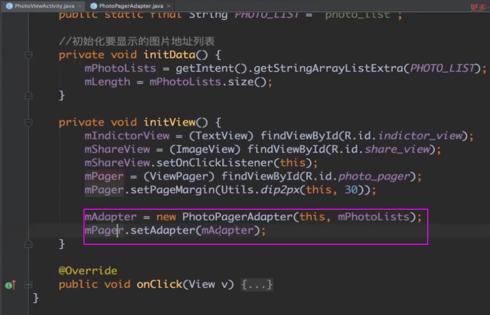 1 package com.youdu.adapter; 2 3 import android.content.Context; 4 import android.content.Intent; 5 import android.support.v4.view.PagerAdapter; 6 import android.view.View; 7 import android.view.ViewGroup; 8 import android.view.ViewGroup.LayoutParams; 9 import android.widget.ImageView; 10 import android.widget.ImageView.ScaleType; 11 12 import com.youdu.activity.CourseDetailActivity; 13 import com.youdu.util.ImageLoaderManager; 14 15 import java.util.ArrayList; 16 17 import uk.co.senab.photoview.PhotoView; 18 19 20 public class PhotoPagerAdapter extends PagerAdapter { 21 22 private Context mContext; 23 24 private boolean mIsMatch; 25 private ArrayList<String> mData; 26 private ImageLoaderManager mLoader; 27 28 public PhotoPagerAdapter(Context context, ArrayList<String> list, boolean isMatch) { 29 mContext = context; 30 mData = list; 31 mIsMatch = isMatch; 32 mLoader = ImageLoaderManager.getInstance(mContext); 33 } 34 35 @Override 36 public int getCount() { 37 return mData.size(); 38 } 39 40 @Override 41 public View instantiateItem(ViewGroup container, int position) { 42 ImageView photoView; 43 if (mIsMatch) { 44 photoView = new ImageView(mContext); 45 photoView.setScaleType(ScaleType.FIT_XY); 46 photoView.setOnClickListener(new View.OnClickListener() { 47 @Override 48 public void onClick(View v) { 49 Intent intent = new Intent(mContext, 50 CourseDetailActivity.class); 51 mContext.startActivity(intent); 52 } 53 }); 54 } else { 55 photoView = new PhotoView(mContext); 56 } 57 mLoader.displayImage(photoView, mData.get(position)); 58 container.addView(photoView, LayoutParams.MATCH_PARENT, 59 LayoutParams.MATCH_PARENT); 60 return photoView; 61 } 62 63 @Override 64 public void destroyItem(ViewGroup container, int position, Object object) { 65 container.removeView((View) object); 66 } 67 68 @Override 69 public boolean isViewFromObject(View view, Object object) { 70 return view == object; 71 } 72 }