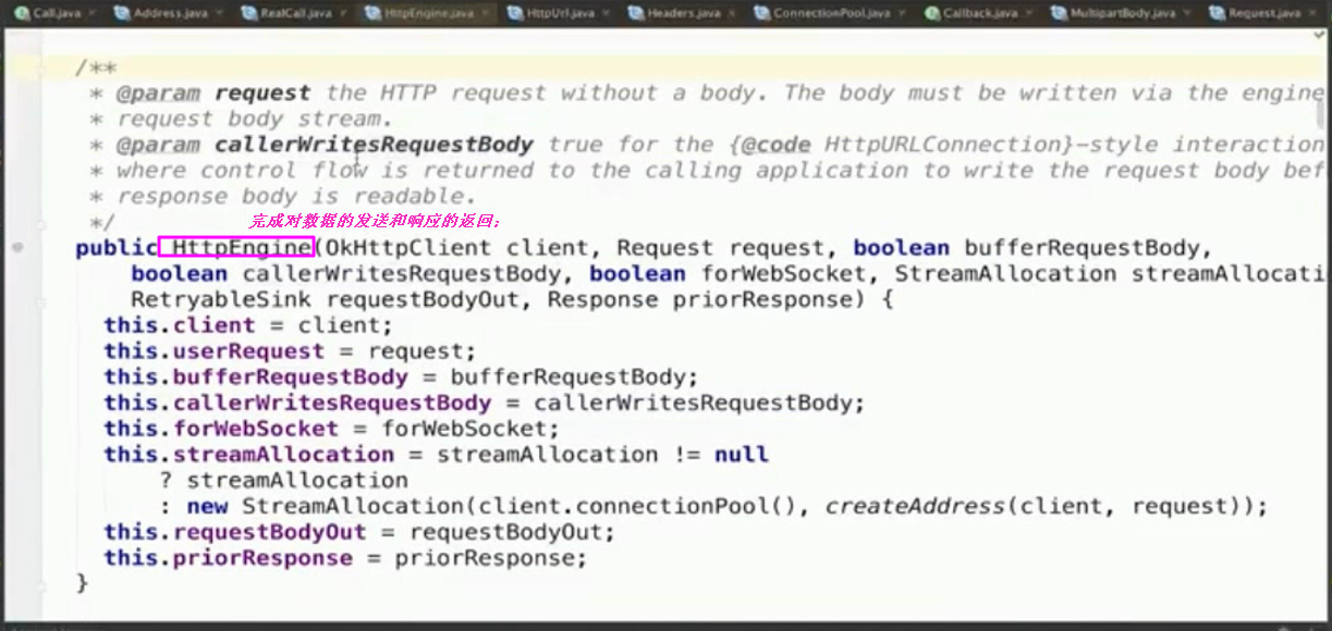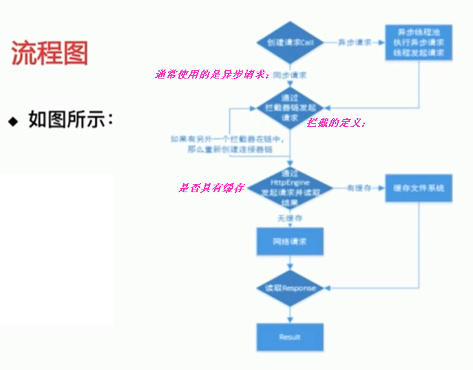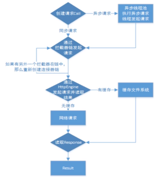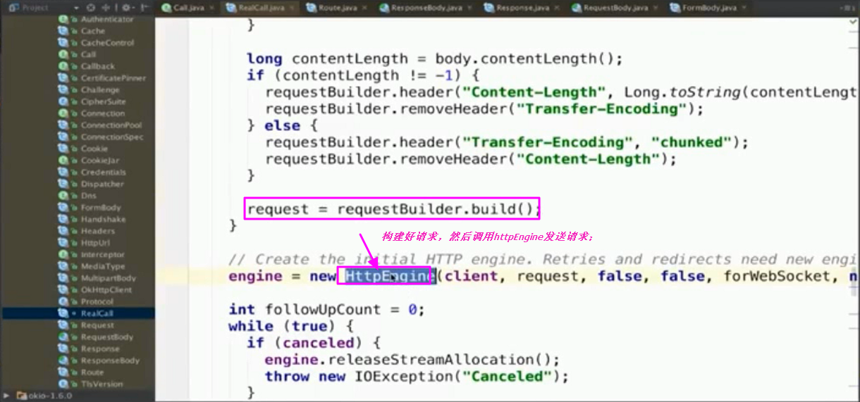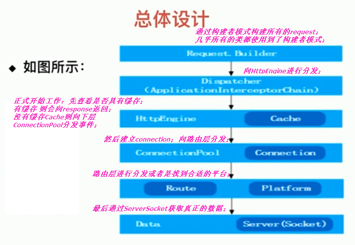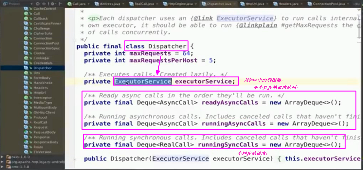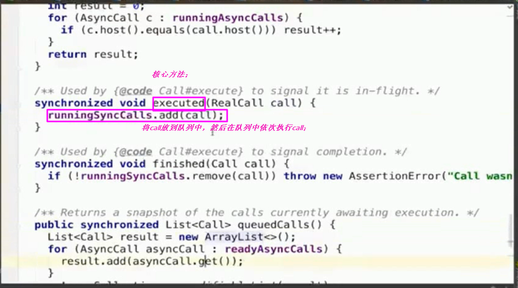 【流程】dispatcher将call数据放到队列中,在队列中依次执行Call,realCall对调用httpEngine,真正的构建connection和request,然后调用connect方法,获取最终的response;封装在respBody中,