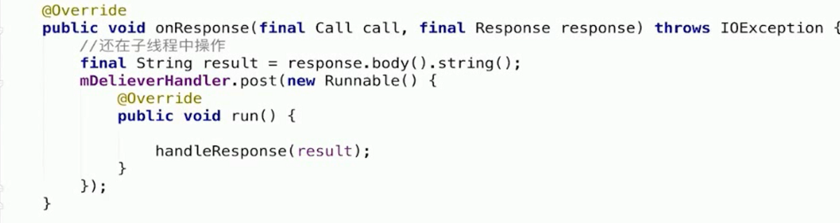 1 package com.okhttp.response; 2 3 import java.io.IOException; 4 import java.util.ArrayList; 5 6 import org.json.JSONObject; 7 8 import com.loopj.android.http.commonhttp.ResponseEntityToModule; 9 import com.okhttp.exception.OkHttpException; 10 import com.okhttp.listener.DisposeDataHandle; 11 import com.okhttp.listener.DisposeDataListener; 12 import com.okhttp.listener.DisposeHandleCookieListener; 13 14 import android.os.Handler; 15 import android.os.Looper; 16 import okhttp3.Call; 17 import okhttp3.Callback; 18 import okhttp3.Headers; 19 import okhttp3.Response; 20 21 /** 22 * @author vision 23 * @function 专门处理JSON的回调 24 */ 25 public class CommonJsonCallback implements Callback { 26 27 /** 28 * the logic layer exception, may alter in different app 29 * 【注意】此段代码是根据公司的服务器的协议进行定制的;不同公司不一致; 30 */ 31 // 有返回则对于http请求来说是成功的,但还有可能是业务逻辑上的错误 32 protected final String RESULT_CODE = "ecode"; 33 protected final int RESULT_CODE_VALUE = 0; 34 protected final String ERROR_MSG = "emsg"; 35 protected final String EMPTY_MSG = ""; 36 protected final String COOKIE_STORE = "Set-Cookie"; // decide the server it 37 // can has the value of 38 // set-cookie2 39 40 /** 41 * the java layer exception, do not same to the logic error 42 */ 43 protected final int NETWORK_ERROR = -1; // the network relative error 44 protected final int JSON_ERROR = -2; // the JSON relative error 45 protected final int OTHER_ERROR = -3; // the unknow error 46 47 /** 48 * 将其它线程的数据转发到UI线程 49 */ 50 private Handler mDeliveryHandler; //数据的转发 51 private DisposeDataListener mListener; //接口; 52 private Class<?> mClass; //要转化为的字符串的数据; 53 54 public CommonJsonCallback(DisposeDataHandle handle) { 55 this.mListener = handle.mListener; 56 this.mClass = handle.mClass; 57 //需要返回到主线程中,因此需要创建主线程的Looper; 58 this.mDeliveryHandler = new Handler(Looper.getMainLooper()); 59 } 60 61 //对返回数据的失败的处理 62 @Override 63 public void onFailure(final Call call, final IOException ioexception) { 64 /** 65 * 此时还在非UI线程,因此要转发 66 */ 67 mDeliveryHandler.post(new Runnable() { 68 @Override 69 public void run() { 70 //直接回调listener中的onFailure即可; 71 mListener.onFailure(new OkHttpException(NETWORK_ERROR, ioexception)); 72 } 73 }); 74 } 75 76 77 @Override 78 public void onResponse(final Call call, final Response response) throws IOException { 79 final String result = response.body().string(); 80 final ArrayList<String> cookieLists = handleCookie(response.headers()); 81 mDeliveryHandler.post(new Runnable() { 82 @Override 83 public void run() { 84 handleResponse(result); //见105行的方法的处理; 85 /** 86 * handle the cookie 87 */ 88 if (mListener instanceof DisposeHandleCookieListener) { 89 ((DisposeHandleCookieListener) mListener).onCookie(cookieLists); 90 } 91 } 92 }); 93 } 94 95 private ArrayList<String> handleCookie(Headers headers) { 96 ArrayList<String> tempList = new ArrayList<String>(); 97 for (int i = 0; i < headers.size(); i++) { 98 if (headers.name(i).equalsIgnoreCase(COOKIE_STORE)) { 99 tempList.add(headers.value(i)); 100 } 101 } 102 return tempList; 103 } 104 105 private void handleResponse(Object responseObj) { 106 if (responseObj == null) { 107 mListener.onFailure(new OkHttpException(NETWORK_ERROR, EMPTY_MSG)); 108 return; 109 } 110 111 try { 112 JSONObject result = new JSONObject(responseObj.toString()); 113 if (result.has(RESULT_CODE)) { 114 if (result.optInt(RESULT_CODE) == RESULT_CODE_VALUE) { 115 //如果没有传入返回的对象; 116 if (mClass == null) { 117 //直接返回到应用层; 118 mListener.onSuccess(result); 119 } else { 120 //对json字符串进行解析; 121 Object obj = ResponseEntityToModule.parseJsonObjectToModule(result, mClass); 122 if (obj != null) { 123 //json数据解析成功,返回给应用层; 124 mListener.onSuccess(obj); 125 } else { 126 //解析失败,抛出异常; 127 mListener.onFailure(new OkHttpException(JSON_ERROR, EMPTY_MSG)); 128 } 129 } 130 } else { 131 if (result.has(ERROR_MSG)) { 132 mListener.onFailure( 133 new OkHttpException(result.optInt(RESULT_CODE), result.optString(ERROR_MSG))); 134 } else { 135 mListener.onFailure(new OkHttpException(result.optInt(RESULT_CODE), EMPTY_MSG)); 136 } 137 } 138 } else { 139 if (result.has(ERROR_MSG)) { 140 mListener.onFailure(new OkHttpException(OTHER_ERROR, result.optString(ERROR_MSG))); 141 } 142 } 143 } catch (Exception e) { 144 mListener.onFailure(new OkHttpException(OTHER_ERROR, e.getMessage())); 145 e.printStackTrace(); 146 } 147 } 148 }