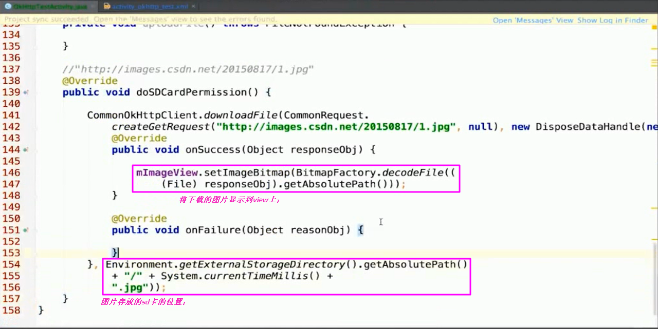 1 package com.okhttp.response; 2 3 import java.io.File; 4 import java.io.FileOutputStream; 5 import java.io.IOException; 6 import java.io.InputStream; 7 8 import com.okhttp.exception.OkHttpException; 9 import com.okhttp.listener.DisposeDataHandle; 10 import com.okhttp.listener.DisposeDownloadListener; 11 12 import android.os.Handler; 13 import android.os.Looper; 14 import android.os.Message; 15 import okhttp3.Call; 16 import okhttp3.Callback; 17 import okhttp3.Response; 18 19 /********************************************************** 20 * @文件名称:CommonFileCallback.java 23 * @文件描述:专门处理文件下载回调 24 * @修改历史:2016年1月23日创建初始版本 25 **********************************************************/ 26 public class CommonFileCallback implements Callback { 27 /** 28 * the java layer exception, do not same to the logic error 29 */ 30 protected final int NETWORK_ERROR = -1; // the network relative error 31 protected final int IO_ERROR = -2; // the JSON relative error 32 protected final String EMPTY_MSG = ""; 33 /** 34 * 将其它线程的数据转发到UI线程 35 */ 36 private static final int PROGRESS_MESSAGE = 0x01; 37 private Handler mDeliveryHandler; 38 private DisposeDownloadListener mListener; 39 private String mFilePath; 40 private int mProgress; 41 42 public CommonFileCallback(DisposeDataHandle handle) { 43 this.mListener = (DisposeDownloadListener) handle.mListener; 44 this.mFilePath = handle.mSource; 45 this.mDeliveryHandler = new Handler(Looper.getMainLooper()) { 46 @Override 47 public void handleMessage(Message msg) { 48 switch (msg.what) { 49 case PROGRESS_MESSAGE: 50 mListener.onProgress((int) msg.obj); 51 break; 52 } 53 } 54 }; 55 } 56 57 @Override 58 public void onFailure(final Call call, final IOException ioexception) { 59 mDeliveryHandler.post(new Runnable() { 60 @Override 61 public void run() { 62 mListener.onFailure(new OkHttpException(NETWORK_ERROR, ioexception)); 63 } 64 }); 65 } 66 67 @Override 68 public void onResponse(Call call, Response response) throws IOException { 69 final File file = handleResponse(response); 70 mDeliveryHandler.post(new Runnable() { 71 @Override 72 public void run() { 73 if (file != null) { 74 mListener.onSuccess(file); 75 } else { 76 mListener.onFailure(new OkHttpException(IO_ERROR, EMPTY_MSG)); 77 } 78 } 79 }); 80 } 81 82 /** 83 * 此时还在子线程中,不则调用回调接口 84 * 85 * @param response 86 * @return 87 */ 88 private File handleResponse(Response response) { 89 if (response == null) { 90 return null; 91 } 92 93 InputStream inputStream = null; 94 File file = null; 95 FileOutputStream fos = null; 96 byte[] buffer = new byte[2048]; 97 int length = -1; 98 int currentLength = 0; 99 double sumLength = 0; 100 try { 101 file = new File(mFilePath); 102 fos = new FileOutputStream(file); 103 inputStream = response.body().byteStream(); 104 sumLength = (double) response.body().contentLength(); 105 106 while ((length = inputStream.read(buffer)) != -1) { 107 fos.write(buffer, 0, length); 108 currentLength += length; 109 mProgress = (int) (currentLength / sumLength * 100); 110 mDeliveryHandler.obtainMessage(PROGRESS_MESSAGE, mProgress).sendToTarget(); 111 } 112 fos.flush(); 113 } catch (Exception e) { 114 file = null; 115 } finally { 116 try { 117 fos.close(); 118 inputStream.close(); 119 } catch (IOException e) { 120 e.printStackTrace(); 121 } 122 } 123 return file; 124 } 125 }