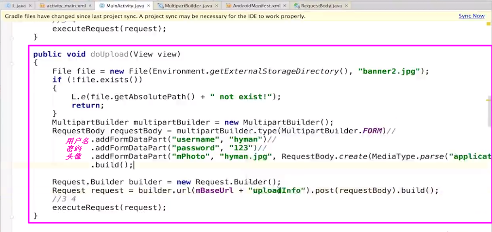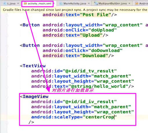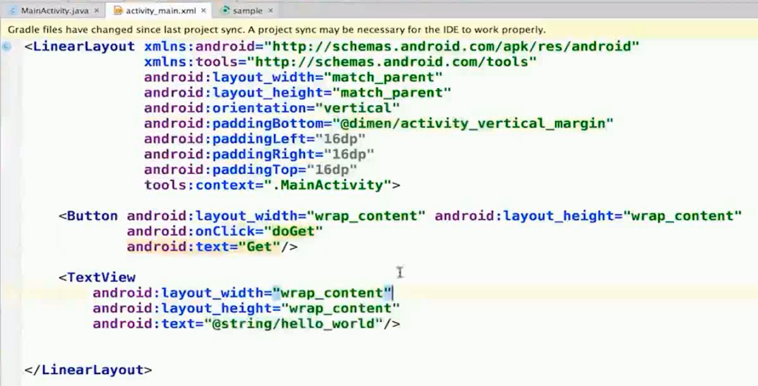 1 <?xml version="1.0" encoding="utf-8"?> 2 <RelativeLayout xmlns:android="http://schemas.android.com/apk/res/android" 3 4 xmlns:app="http://schemas.android.com/apk/res-auto" 5 xmlns:tools="http://schemas.android.com/tools" 6 android:layout_width="match_parent" 7 android:layout_height="match_parent" 8 tools:context="com.air.sample.MainActivity"> 9 10 <Button 11 android:id="@+id/button" 12 android:layout_width="match_parent" 13 android:layout_height="wrap_content" 14 android:layout_alignParentStart="true" 15 android:layout_alignParentTop="true" 16 android:onClick="doGet" 17 android:text="Get" /> 18 19 <Button 20 android:id="@+id/button2" 21 android:layout_width="match_parent" 22 android:layout_height="wrap_content" 23 android:layout_alignParentStart="true" 24 android:layout_below="@+id/result" 25 android:onClick="doPost" 26 android:text="Post" /> 27 28 29 <TextView 30 android:id="@+id/result" 31 android:layout_width="match_parent" 32 android:layout_height="wrap_content" 33 android:layout_alignParentStart="true" 34 android:layout_below="@+id/button" 35 android:text="hello" /> 36 37 <Button 38 android:id="@+id/button3" 39 android:layout_width="match_parent" 40 android:layout_height="wrap_content" 41 android:layout_alignParentStart="true" 42 android:layout_below="@+id/button2" 43 android:onClick="doPostString" 44 android:text="Post String" /> 45 46 <Button 47 android:id="@+id/button4" 48 android:layout_width="match_parent" 49 android:layout_height="wrap_content" 50 android:layout_below="@+id/button3" 51 android:onClick="doPostFile" 52 android:text="POST FILE" /> 53 54 <Button 55 android:id="@+id/button5" 56 android:layout_width="wrap_content" 57 android:layout_height="wrap_content" 58 android:layout_alignParentEnd="true" 59 android:layout_alignParentStart="true" 60 android:layout_below="@+id/button4" 61 android:onClick="doPostUpload" 62 android:text="Upload" /> 63 64 <Button 65 android:id="@+id/button6" 66 android:layout_width="match_parent" 67 android:layout_height="wrap_content" 68 android:layout_alignParentEnd="true" 69 android:layout_below="@+id/button5" 70 android:onClick="doDownLoad" 71 android:text="DOWNLOAD" /> 72 73 74 <Button 75 android:id="@+id/button7" 76 android:layout_width="match_parent" 77 android:layout_height="wrap_content" 78 android:layout_alignParentEnd="true" 79 android:layout_below="@+id/button6" 80 android:onClick="doDownLoadImg" 81 android:text="doDownLoadImg" /> 82 83 <ImageView 84 android:id="@+id/imageView" 85 android:layout_width="match_parent" 86 android:layout_height="wrap_content" 87 android:layout_below="@+id/button7" 88 android:layout_centerHorizontal="true" 89 android:scaleType="centerCrop" 90 /> 91 92 </RelativeLayout>