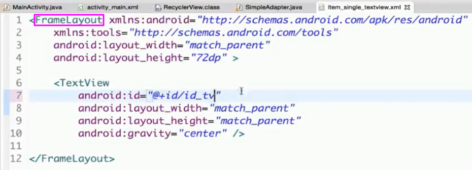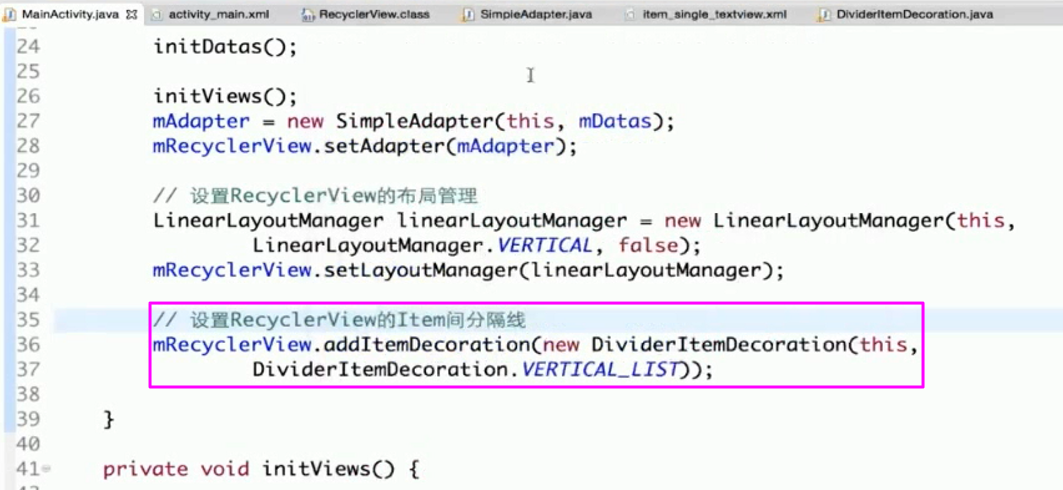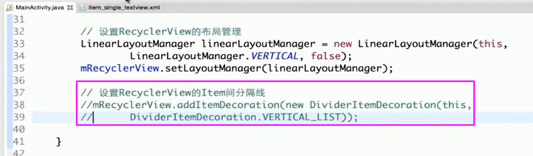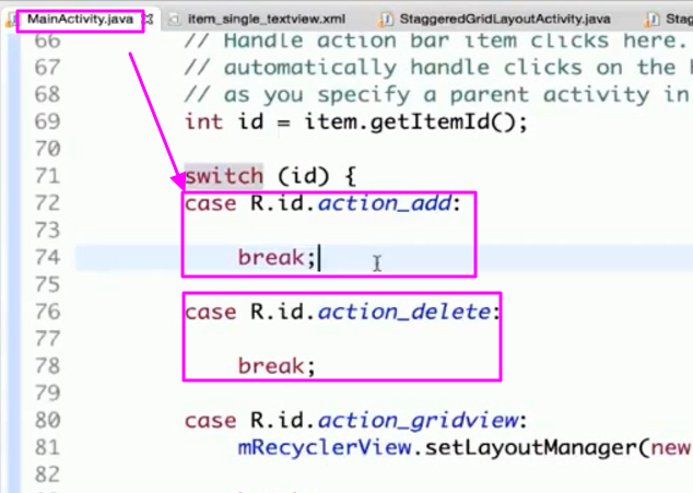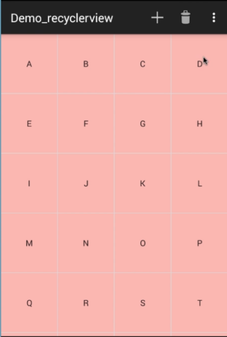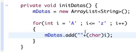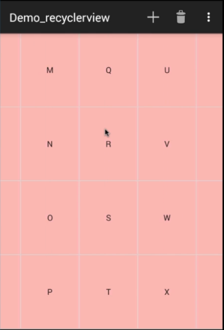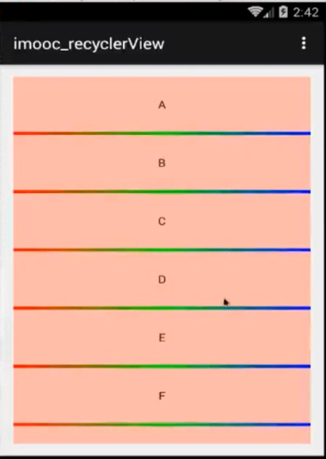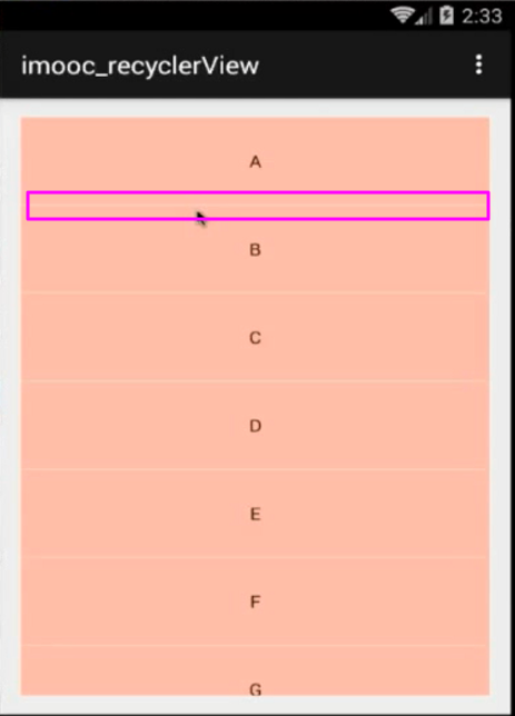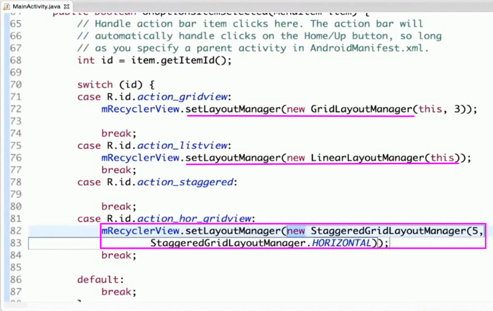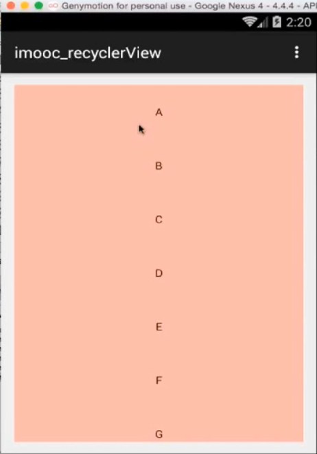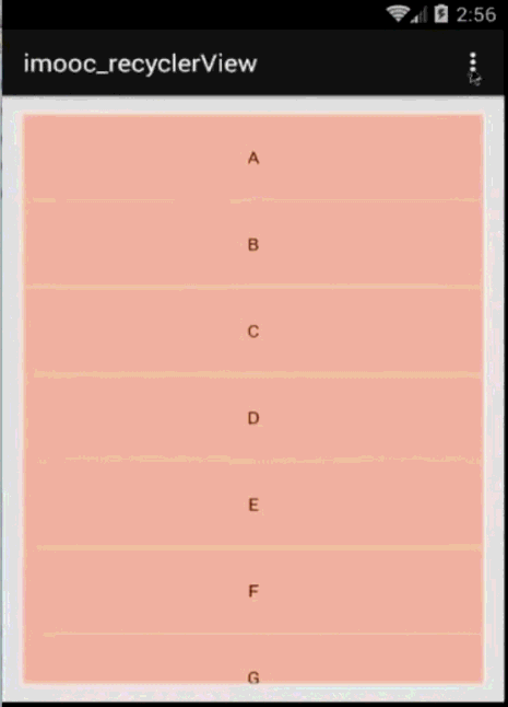 1 package com.example.shang.recyclerviewtest; 2 3 import android.content.Intent; 4 import android.os.Bundle; 5 import android.support.v7.app.AppCompatActivity; 6 import android.support.v7.widget.GridLayoutManager; 7 import android.support.v7.widget.LinearLayoutManager; 8 import android.support.v7.widget.RecyclerView; 9 import android.support.v7.widget.StaggeredGridLayoutManager; 10 import android.view.Menu; 11 import android.view.MenuItem; 12 import android.view.View; 13 14 import java.util.ArrayList; 15 import java.util.List; 16 17 public class StaggeredActivity extends AppCompatActivity { 18 19 private RecyclerView mRecyclerView; 20 private List<String> mDatas; 21 private StaggeredAdapter myAdapter; 22 23 @Override 24 protected void onCreate(Bundle savedInstanceState) { 25 super.onCreate(savedInstanceState); 26 setContentView(R.layout.activity_main); 27 initDatas(); 28 initView(); 29 myAdapter = new StaggeredAdapter(this,mDatas); 30 // 记得recycleView需要layoutManager的支持,否则应用虽不会崩溃,但是显示空白 31 //mRecyclerView.setLayoutManager(new LinearLayoutManager(this)); 32 mRecyclerView.setLayoutManager(new StaggeredGridLayoutManager(3,StaggeredGridLayoutManager.VERTICAL)); 33 34 //Context context, int spanCount(数量), int orientation(方向), boolean reverseLayout(是否反转) 35 // mRecyclerView.setLayoutManager(new GridLayoutManager(this,3, GridLayout.VERTICAL,false)); 36 //DividerItemDecoration在包package android.support.v7.widget已经有了,不用再去复制了 37 //mRecyclerView.addItemDecoration(new DividerItemDecoration(this,DividerItemDecoration.VERTICAL)); 38 mRecyclerView.setAdapter(myAdapter); 39 } 40 41 private void initView() { 42 mRecyclerView = (RecyclerView) findViewById(R.id.id_recyclerView); 43 } 44 45 private void initDatas() { 46 mDatas = new ArrayList<>(); 47 for (int i = 'A';i<='z';i++){ 48 mDatas.add(""+(char)i); 49 } 50 } 51 52 @Override 53 public boolean onCreateOptionsMenu(Menu menu) { 54 getMenuInflater().inflate(R.menu.menu,menu); 55 return true; 56 } 57 58 @Override 59 public boolean onOptionsItemSelected(MenuItem item) { 60 61 // int id = item.getItemId(); 62 // switch (id){} 63 64 return super.onOptionsItemSelected(item); 65 66 } 67 }