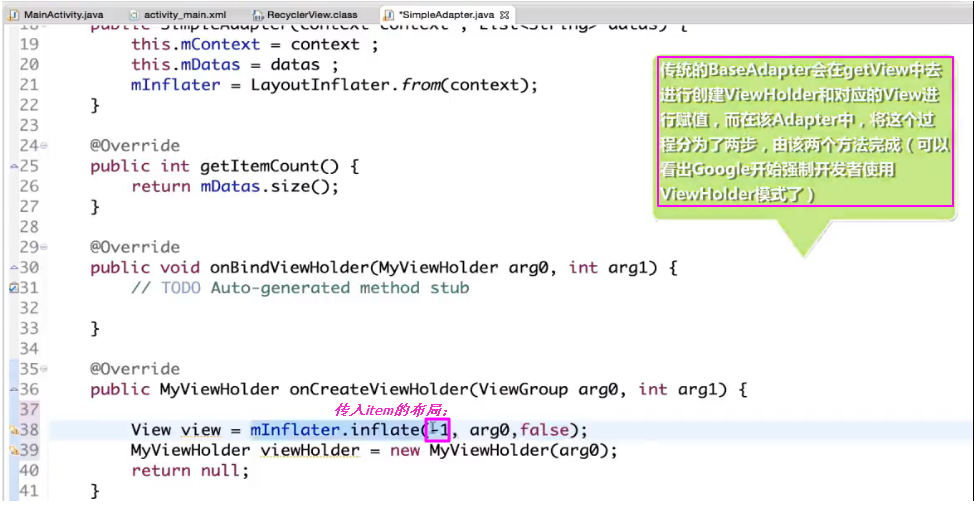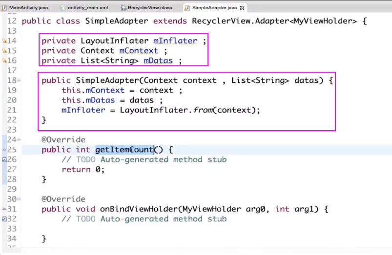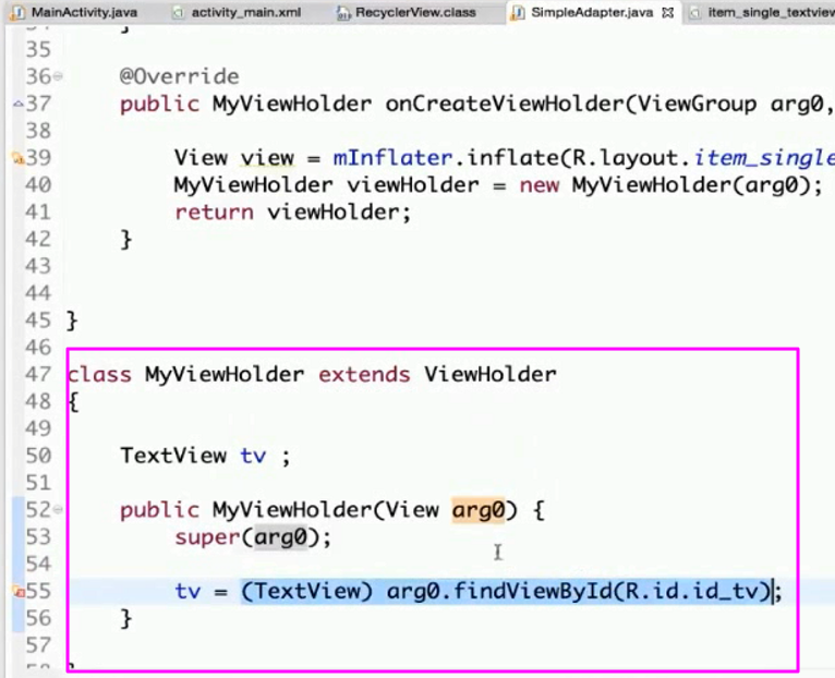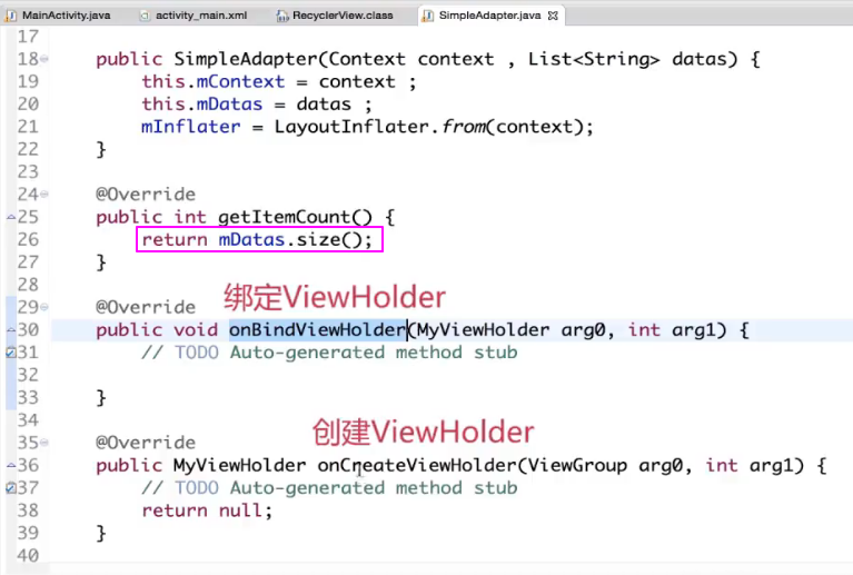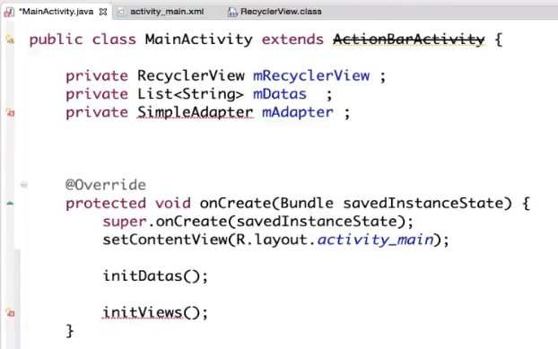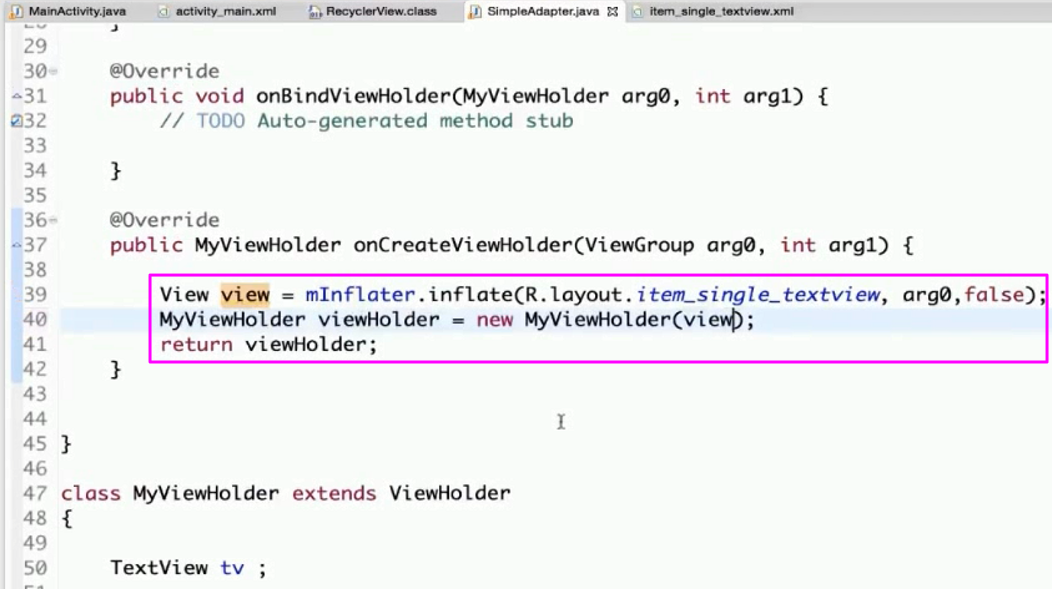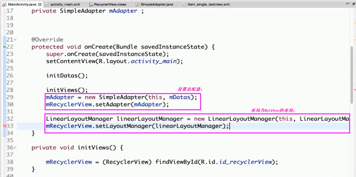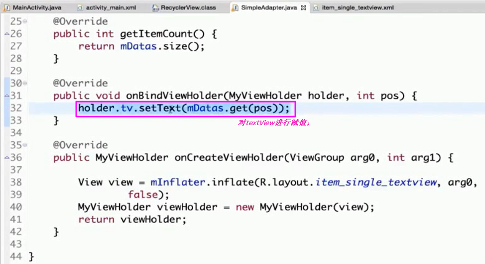 1 package com.example.shang.recyclerviewtest; 2 3 import android.content.Intent; 4 import android.os.Bundle; 5 import android.support.v7.app.AppCompatActivity; 6 import android.support.v7.widget.GridLayoutManager; 7 import android.support.v7.widget.LinearLayoutManager; 8 import android.support.v7.widget.RecyclerView; 9 import android.support.v7.widget.StaggeredGridLayoutManager; 10 import android.view.Menu; 11 import android.view.MenuItem; 12 import android.view.View; 13 14 import java.util.ArrayList; 15 import java.util.List; 16 17 public class StaggeredActivity extends AppCompatActivity { 18 19 private RecyclerView mRecyclerView; 20 private List<String> mDatas; 21 private StaggeredAdapter myAdapter; 22 23 @Override 24 protected void onCreate(Bundle savedInstanceState) { 25 super.onCreate(savedInstanceState); 26 setContentView(R.layout.activity_main); 27 initDatas(); 28 initView(); 29 myAdapter = new StaggeredAdapter(this,mDatas); 30 // 记得recycleView需要layoutManager的支持,否则应用虽不会崩溃,但是显示空白 31 //mRecyclerView.setLayoutManager(new LinearLayoutManager(this)); 32 mRecyclerView.setLayoutManager(new StaggeredGridLayoutManager(3,StaggeredGridLayoutManager.VERTICAL)); 33 34 //Context context, int spanCount(数量), int orientation(方向), boolean reverseLayout(是否反转) 35 // mRecyclerView.setLayoutManager(new GridLayoutManager(this,3, GridLayout.VERTICAL,false)); 36 //DividerItemDecoration在包package android.support.v7.widget已经有了,不用再去复制了 37 //mRecyclerView.addItemDecoration(new DividerItemDecoration(this,DividerItemDecoration.VERTICAL)); 38 mRecyclerView.setAdapter(myAdapter); 39 } 40 41 private void initView() { 42 mRecyclerView = (RecyclerView) findViewById(R.id.id_recyclerView); 43 } 44 45 private void initDatas() { 46 mDatas = new ArrayList<>(); 47 for (int i = 'A';i<='z';i++){ 48 mDatas.add(""+(char)i); 49 } 50 } 51 52 @Override 53 public boolean onCreateOptionsMenu(Menu menu) { 54 getMenuInflater().inflate(R.menu.menu,menu); 55 return true; 56 } 57 58 @Override 59 public boolean onOptionsItemSelected(MenuItem item) { 60 61 // int id = item.getItemId(); 62 // switch (id){} 63 64 return super.onOptionsItemSelected(item); 65 66 } 67 }