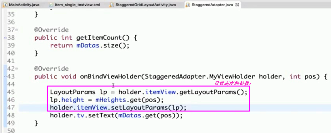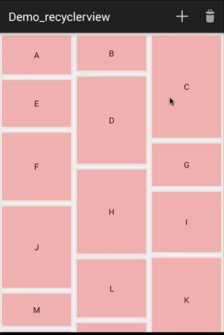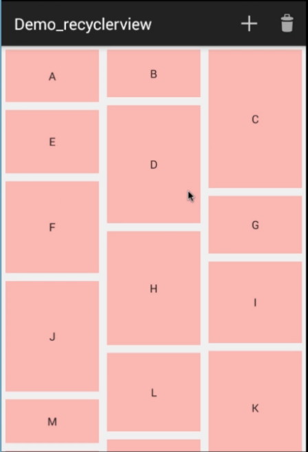 1 package com.example.shang.recyclerviewtest; 2 3 import android.content.Context; 4 import android.view.ViewGroup; 5 6 import java.util.ArrayList; 7 import java.util.List; 8 9 // 直接继承前面的adapter,不用再写那个回调接口,而且代码也变简洁了 10 public class StaggeredAdapter extends MyViewAdapter{ 11 12 13 private List<Integer>mHeights; 14 15 public StaggeredAdapter(Context context, List<String>datas){ 16 super(context,datas); 17 18 mHeights = new ArrayList<>(); 19 for (int i = 0; i<mDatas.size();i++){ 20 mHeights.add((int) (100+Math.random()*300)); 21 } 22 } 23 24 25 @Override 26 public void onBindViewHolder(MyViewHolder holder, int position) { 27 holder.mItemTX.setText(mDatas.get(position)); 28 ViewGroup.LayoutParams lp = holder.itemView.getLayoutParams(); 29 lp.height = mHeights.get(position); 30 holder.itemView.setLayoutParams(lp); 31 32 33 setUpItemEvent(holder); 34 } 35 36 37 38 }