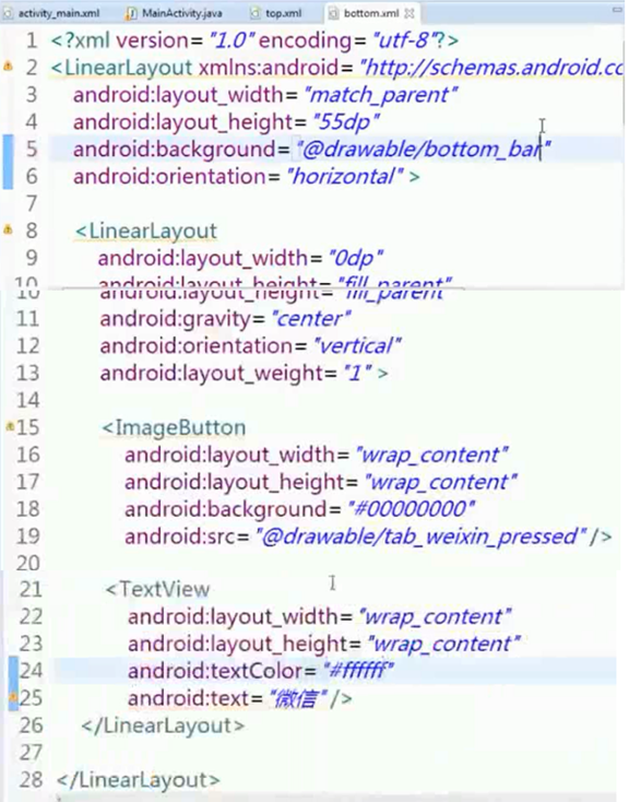 【底部布局】复制四份linearLayout,然后分别修改text内容和图片;需要分别设置id,包括textVIew和imagVew;