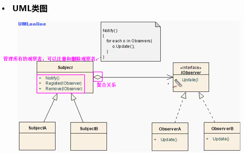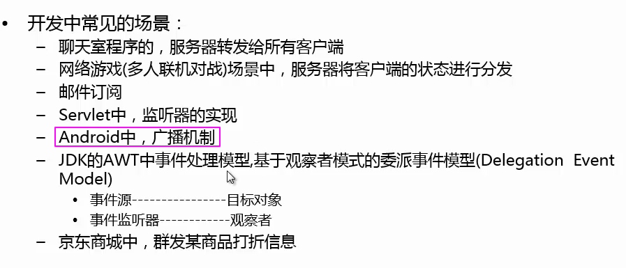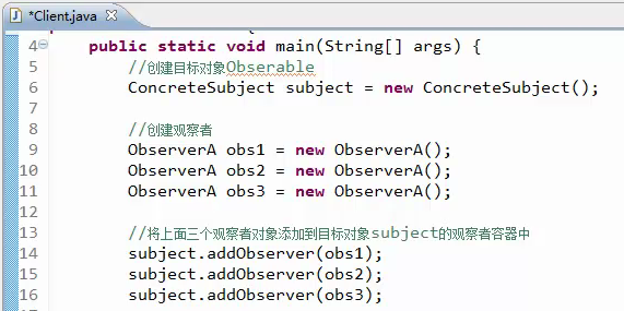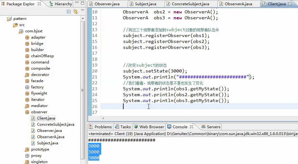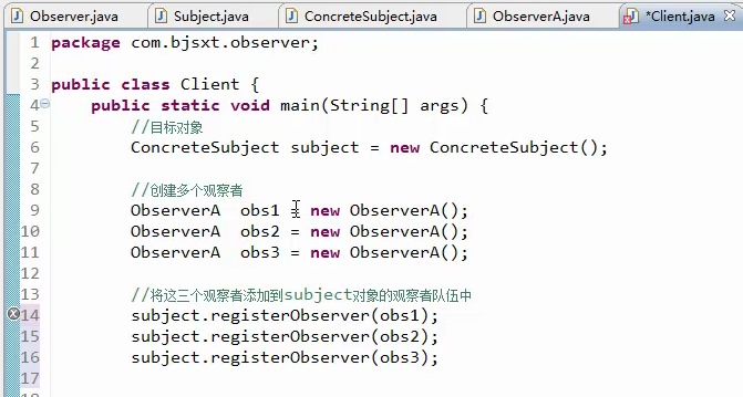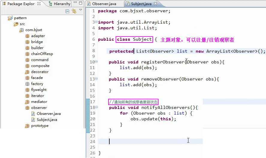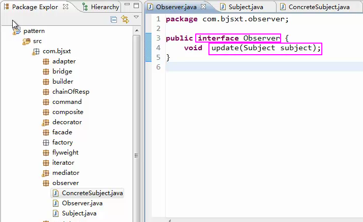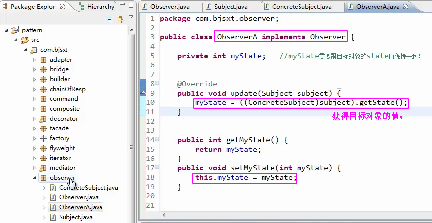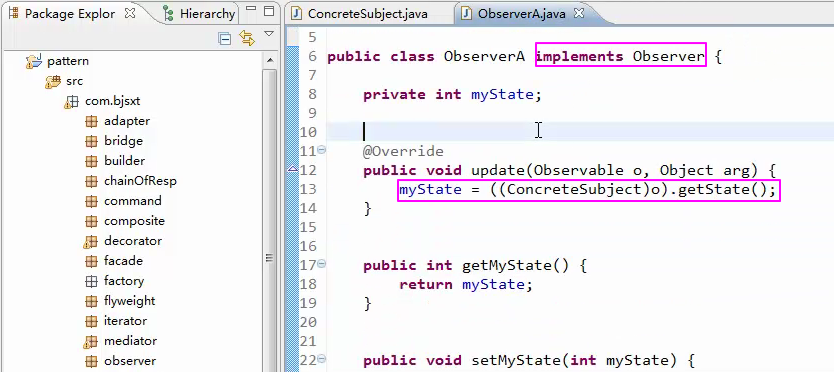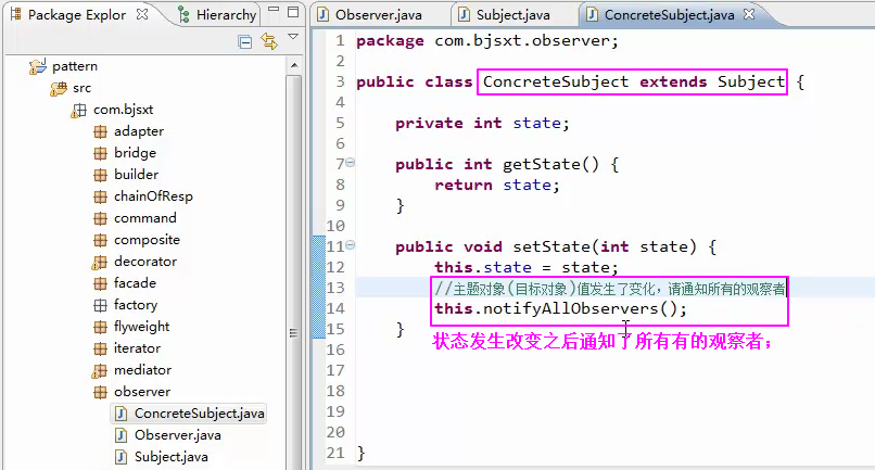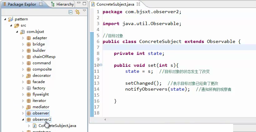 1 package com.example.administrator.demo; 2 3 import java.util.Observable; 4 5 public class Subject extends Observable { 6 public int state; 7 8 public int getState() { 9 return state; 10 } 11 12 ////只有在setState被调用后,notifyObservers()才会去调用update(),否则什么都不干。 13 public void setState(int state) { 14 this.state = state; 15 setChanged(); 16 notifyObservers(state); 17 } 18 19 20 }