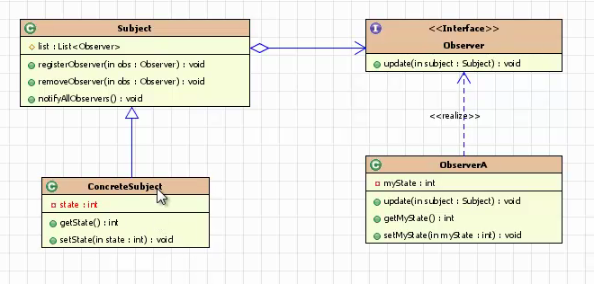 1 package com.example.administrator.demo; 2 3 import java.util.Observable; 4 import java.util.Observer; 5 6 7 public class ObserverA implements Observer { 8 9 private int myState; 10 11 12 public int getMyState() { 13 return myState; 14 } 15 16 17 public void setMyState(int myState) { 18 this.myState = myState; 19 } 20 21 @Override 22 public void update(Observable o, Object arg) { 23 myState = ((Subject) o).getState(); 24 25 } 26 27 }
