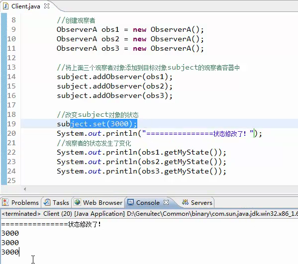 【调用】主题的状态发生了改变,观察者接收到的同样也发生了改变;