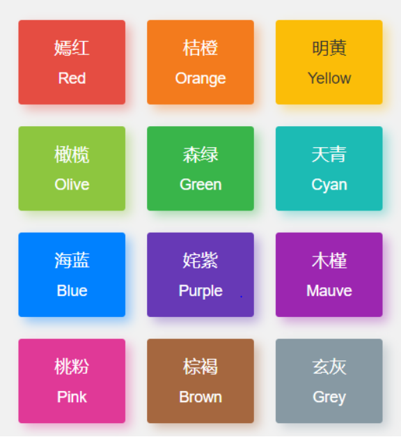 ColorList: [ {title: '嫣红',name: 'red', color: '#e54d42',rgb: (229,77,66)}, {title: '桔橙',name: 'orange',color: '#f37b1d',rgb: (243,123,29)}, {title: '明黄',name: 'yellow',color: '#fbbd08',rgb: (251,189,8)}, {title: '橄榄',name: 'olive', color: '#8dc63f',rgb: (141,198,63)}, {title: '森绿',name: 'green', color: '#39b54a',rgb: (57,181,74)}, {title: '天青',name: 'cyan', color: '#1cbbb4',rgb: (28,187,180)}, {title: '海蓝',name: 'blue', color: '#0081ff',rgb: (0,129,255)}, {title: '姹紫',name: 'purple',color: '#6739b6',rgb: (103,57,182)}, {title: '木槿',name: 'mauve', color: '#9c26b0',rgb: (156,38,176)}, {title: '桃粉',name: 'pink', color: '#e03997',rgb: (224,57,151)}, {title: '棕褐',name: 'brown', color: '#a5673f',rgb: (165,103,63)}, {title: '玄灰',name: 'grey', color: '#8799a3',rgb: (135,153,163)}, ]