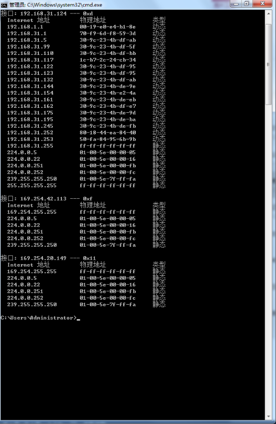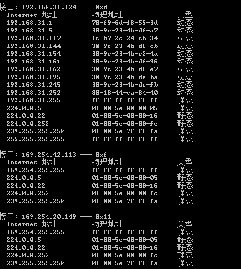 ARP欺骗前192.168.31.123. 124机正常缓存表(实验中的IP可能和本IP不一样)