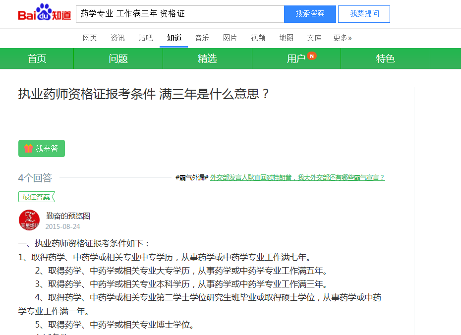 小丽是药学专业的一名本科生,现已从事药学专业的工作,目前她想考取一个资格证,但是报名条件中要求其工作满三年。那么,小丽想考取的是什么证。(请回答并附截图证明。)