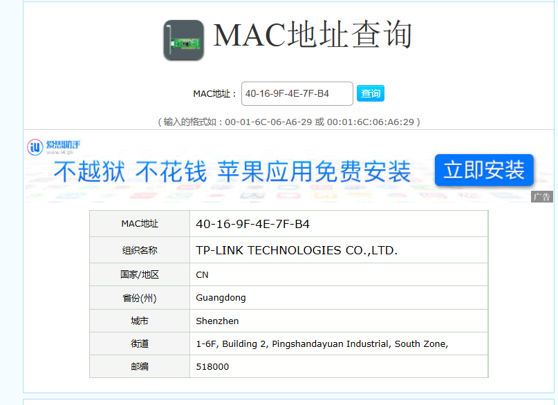 在一个案件中,获取了犯罪嫌疑人的一个MAC地址:40-16-9F-4E-7F-B4,请查询该MAC地址对应的厂商是(附截图)