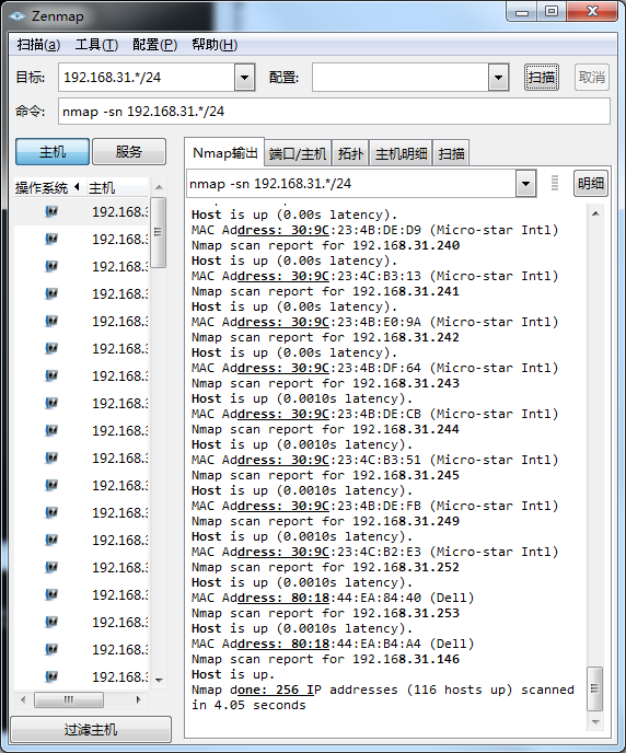 请查询本机的IP地址和子网掩码,并在局域网中扫描本网段内的所有存活主机(附搜索截图)