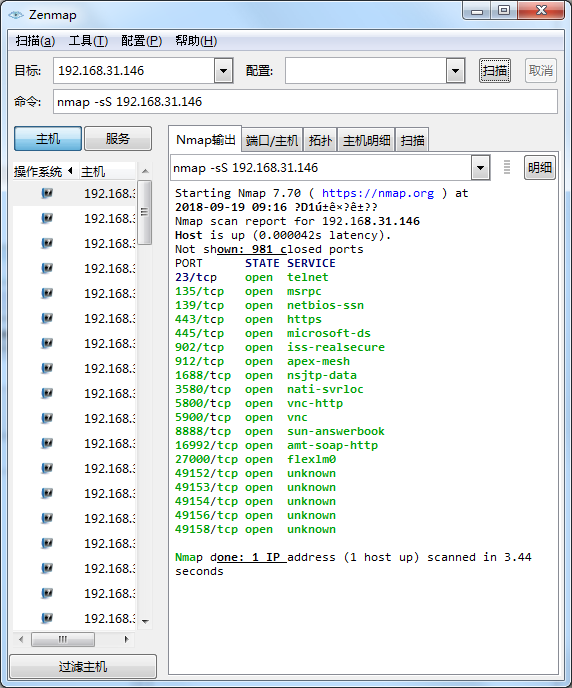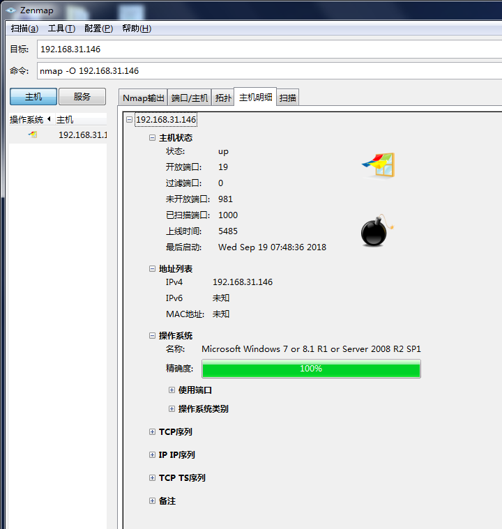 选择一个存活IP地址,扫描所开放的端口(分别用ping扫描,syn扫描尝试),并查询常用端口所对应的服务及操作系统信息。