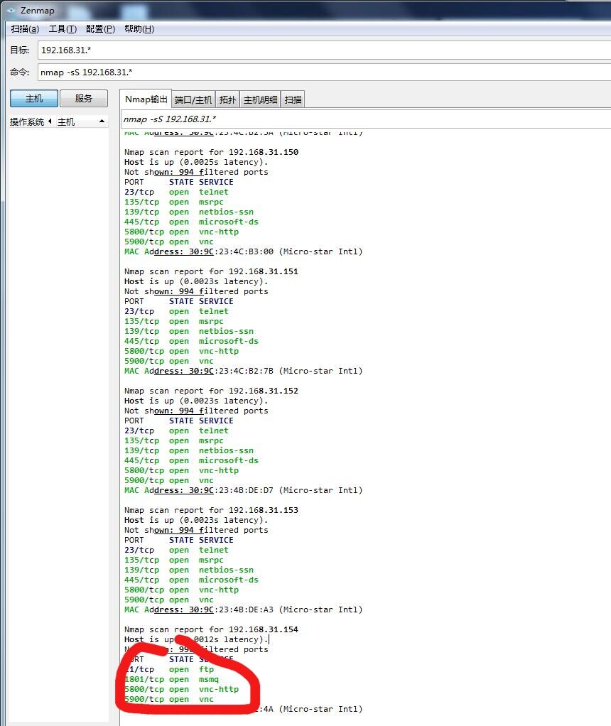 在实验楼上网的局域网内,请扫描出来,哪些机器开启了ftp服务,哪些机器开启了远程桌面连接服务,并附截图证明。