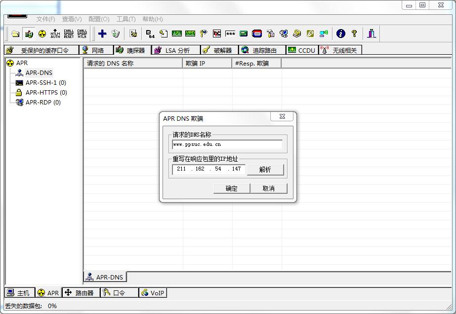 3.B同学扮演攻击者,设计攻击方法,使用CAIN,通过DNS欺骗的方式,让A同学访问www.ppsuc.edu.cn网址的时候,访问到另外一台机器上的伪造网站