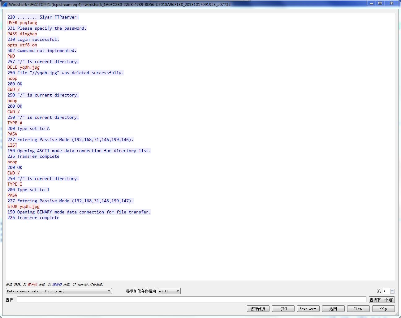 4.B同学停止Wireshark抓包,并和A同学一起分析数据包中的FTP登录过程,还原登录用户名和密码,以及上传文件。