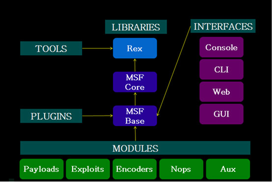 Metasploit Framework并不止具有exploit(溢出)收集功能,它使你专注于创建自己的溢出模块或者二次开发。很少的一部分用汇编和C语言实现,其余均由ruby实现。总体架构:
