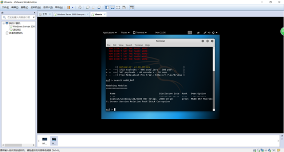 在msfconsole使用search命令搜索MS08067漏洞攻击程序