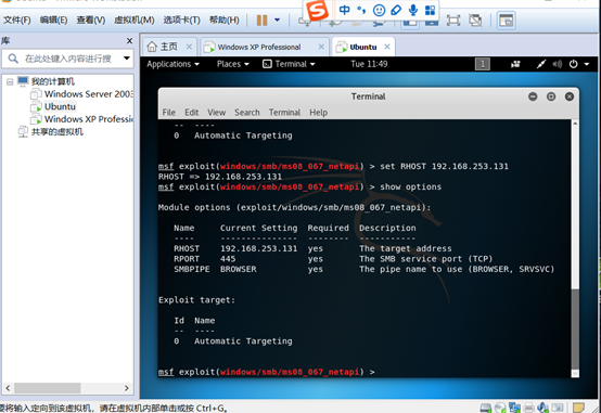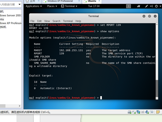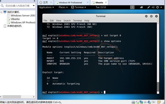 从图中可以看到还需设置RHOST(目标地址)、Exploit target(攻击目标)使用 set 命令设置 Module Options,此处需要设置目标IP即 set RHOST 192.168.146.133