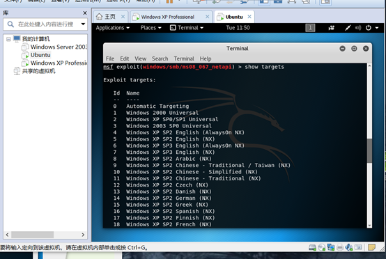 从中可以看出目标IP已经设置好接着设置Exploit target,使用show targets 查看可选项可以看出以下版本的系统均存在此漏洞