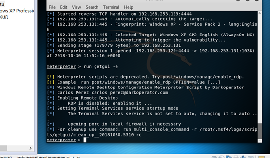 在meterpreter中输入run getgui -e 命令,可以打开RDP(远程桌面)服务,端口号3389。