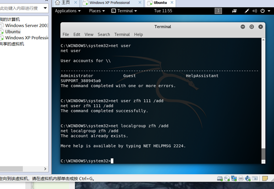 接着使用net user命令查看XP系统中的用户
