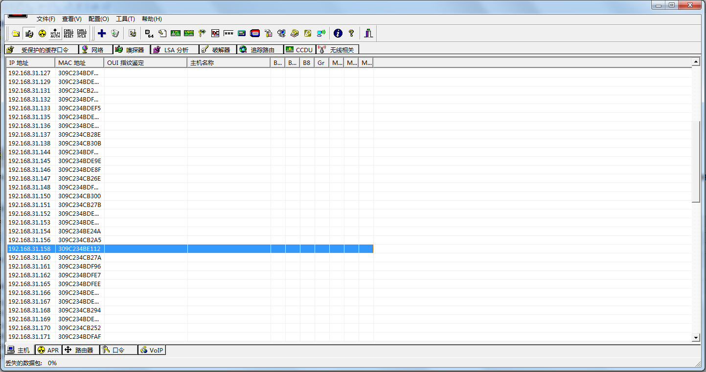 3、点选工具栏中的网卡图标,之后选择sniffer页,再选择左下角的hosts,右键选择“scan MAC address”,扫描局域网中的活动主机IP及MAC地址