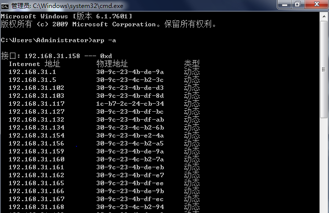 ARP欺骗前192.168.31.158机正常缓存表(实验中的IP可能和本IP不一样)