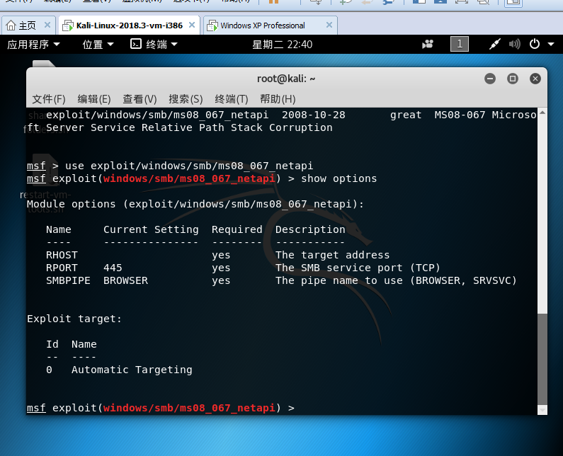 从图中可以看到还需设置RHOST(目标地址)、Exploit target(攻击目标)使用 set 命令设置 Module Options,此处需要设置目标IP即 set RHOST 192.168.176.130