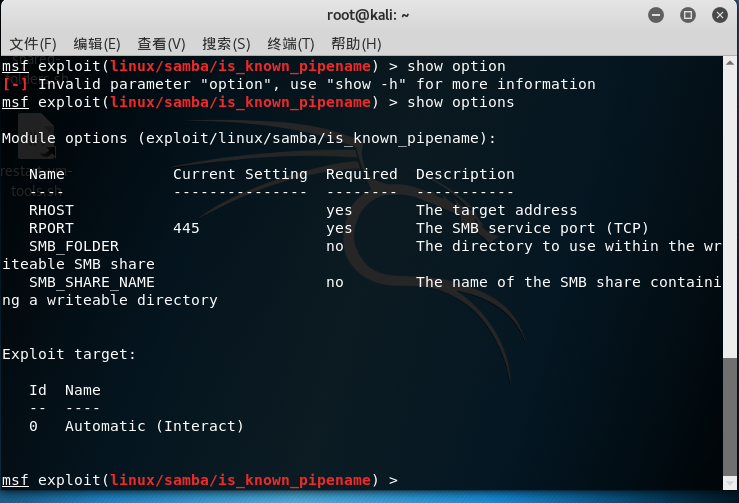 进入msf的交互式命令窗口下,使用show options 命令查看需要设置的选项。