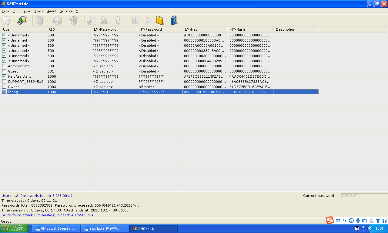 3.使用saminside软件将sam.txt导入,并进行破解,注意配置字典破解和暴力破解