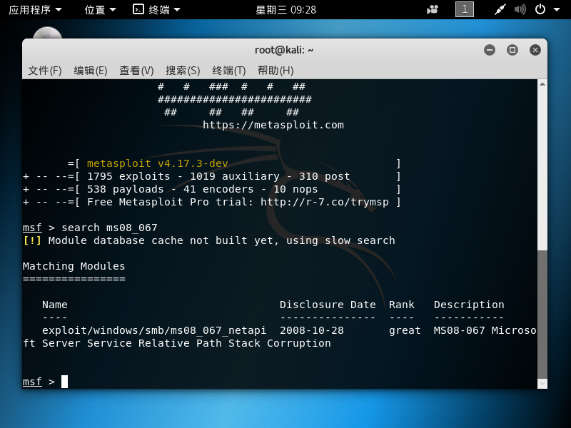 在msfconsole使用search命令搜索MS08067漏洞攻击程序