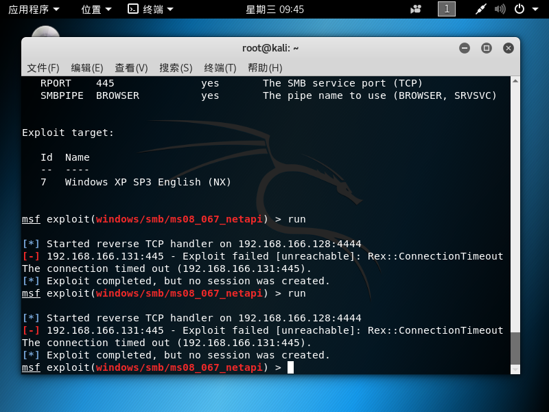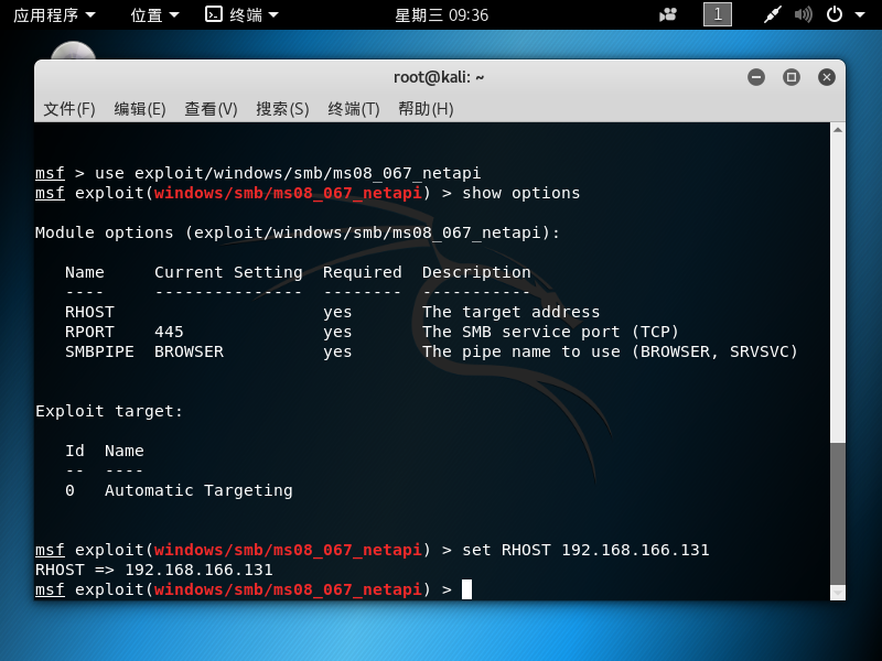 从图中可以看到还需设置RHOST(目标地址)、Exploit target(攻击目标)使用 set 命令设置 Module Options,此处需要设置目标IP即 set RHOST 192.168.166.131