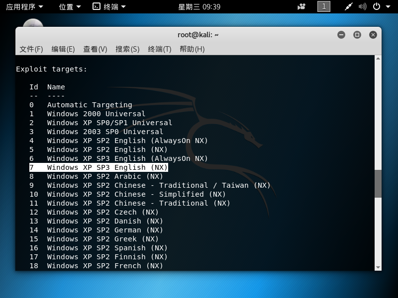 从中可以看出目标IP已经设置好接着设置Exploit target,使用show targets 查看可选项可以看出以下版本的系统均存在此漏洞