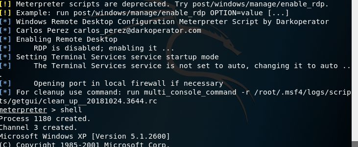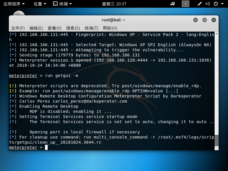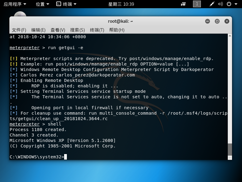 在meterpreter中输入run getgui -e 命令,可以打开RDP(远程桌面)服务,端口号3389。