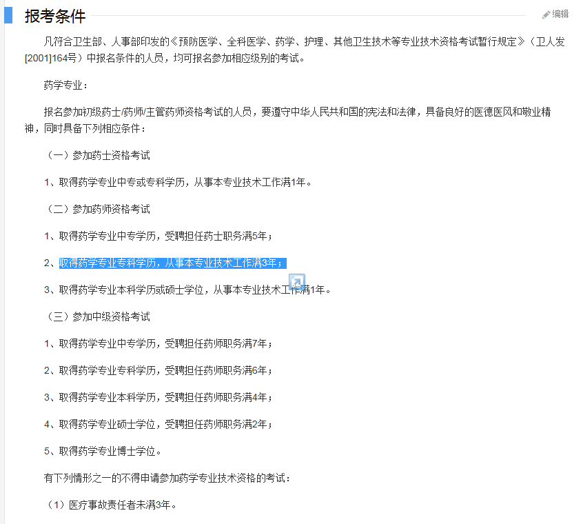 小丽是药学专业的一名本科生,现已从事药学专业的工作,目前她想考取一个资格证,但是报名条件中要求其工作满三年。那么,小丽想考取的是什么证。(请回答并附截图证明。)